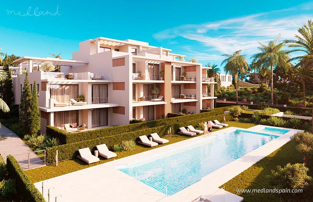 Exklusive Wohnungen in 400 m Entfernung zum Strand in Estepona. Eine privilegierte Lage, in der Nähe des Meeres, umgeben von Dienstleistungen und nur 15 Minuten Fahrt vom schönen historischen Zentrum des Ortes entfernt. Für Golfliebhaber gibt es in einem Umkreis von 20 km mehrere Golfplätze, wie Atalaya Golf & Country Club, Paraiso Golf Club und Marbella Club Golf Resort. Andere wichtige Urlaubsorte an der Costa del Sol sind leicht zu erreichen, wie Puerto Banús, lediglich 15 Minuten entfernt, oder Marbella und Sotogrande in 30 Minuten Fahrzeit. Der internationale Flughafen von Málaga ist weniger als eine Stunde entfernt.Das Projekt bietet Wohnungen mit 2, 3 oder 4 Schlafzimmern, verteilt auf mehrere Gebäude. Um den Bedürfnissen jedes zukünftigen Eigentümers gerecht zu werden, stehen verschiedene Modelle zur Auswahl: Erdgeschosse mit privatem Garten, Mittelgeschosse mit großen Terrassen, Penthäuser mit privater Dachterrasse und Penthäuser auf 2 Etagen mit 3 oder 4 Schlafzimmern und mehreren Terrassen. In allen Wohnungen ist der Wohnbereich ein offen gestaltet, bei dem Wohnzimmer, Esszimmer und Küche in einen großen Raum integriert sind. Dank der großen Fenster, die sowohl vom Wohnzimmer als auch vom Hauptschlafzimmer aus Zugang zur Terrasse bieten, sind die Wohnungen sehr hell und nutzen das natürliche Licht optimal aus. Das Hauptschlafzimmer verfügt über ein eigenes Badezimmer mit Doppelwaschbecken und Ankleideraum. In den Duplex-Modellen befindet sich das Hauptschlafzimmer im ersten Stock. Je nach Ausrichtung und Lage bieten einige Wohnungen Meerblick.Die Wohnungen beinhalten eine Klimaanlage mit Wärmepumpe (warm/kalt), Fußbodenheizung, eine voll ausgestattete Küche mit Markengeräten, Doppelverglasung, voll ausgestattete Badezimmer, einen Abstellraum und 2 Stellplätze in der gemeinschaftlichen Tiefgarage.Die Anlage ist vollständig geschlossen und verfügt über eine 24-Stunden-Rezeption und einen Sicherheitsdienst, der den Bewohnern eine sichere und private Umgebung bietet. Um das mediterrane Klima an der Costa del Sol genießen zu können, stehen den Bewohnern Außenpools und schöne tropische Gärten mit Bewässerungssystem zur Verfügung.