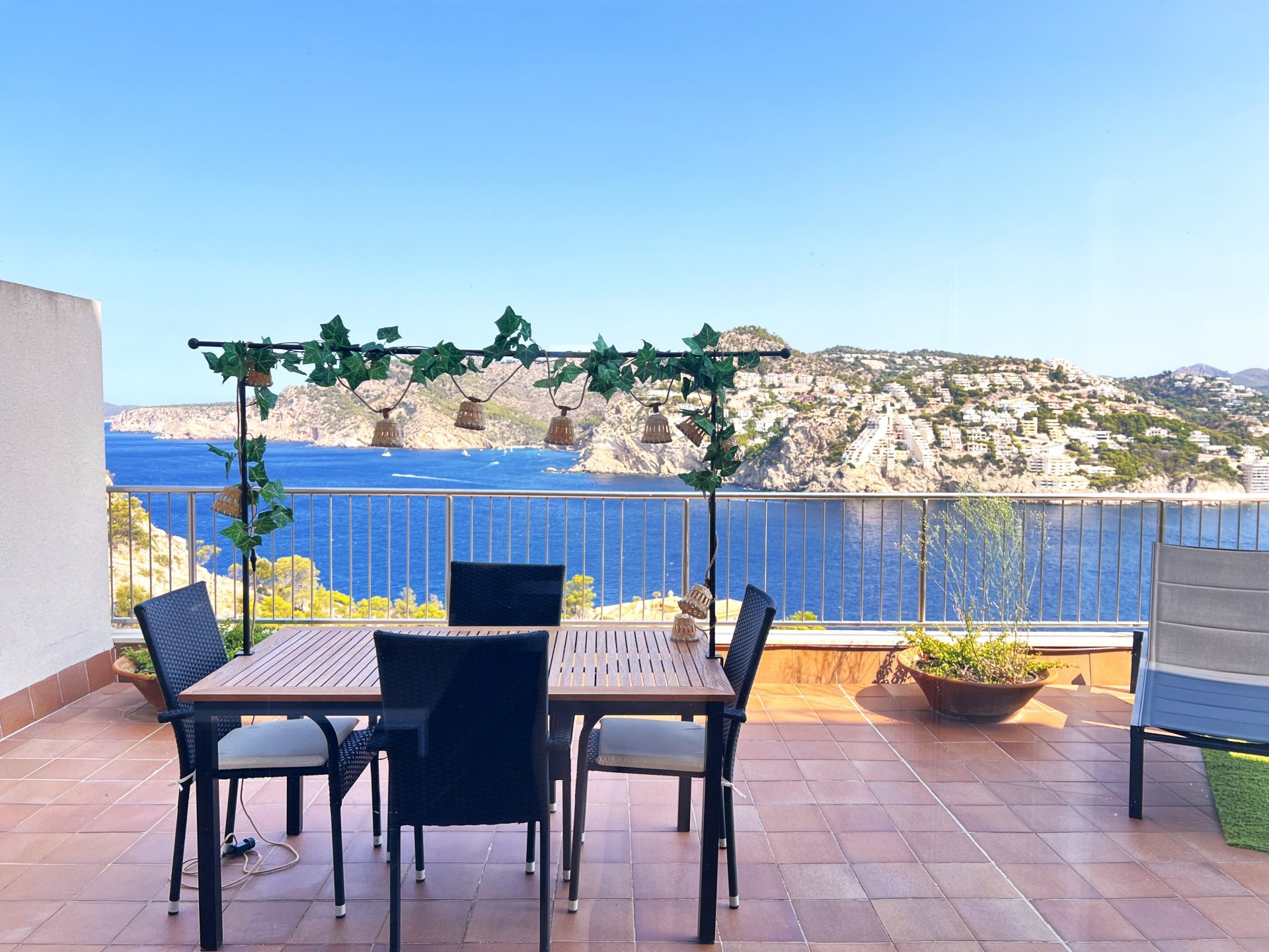 Exklusive Wohnung in La Mola, Andratx: stilvoll eingerichtet, Meerblick, XXL-Terrasse, Pool, Gym & Garage – wohnen in erster Linie.Diese elegante Wohnung bietet 2 Schlafzimmer und 2 Bäder, davon eines en suite, und überzeugt mit geschmackvollem Interieur. Ausgestattet mit Fußbodenheizung, Klimaanlage warm/kalt sowie Aufzug, garantiert sie höchsten Wohnkomfort. Die riesige Terrasse eröffnet einen spektakulären Meerblick. Ein Tiefgaragenstellplatz, ein privater Gym-Raum und der Community Pool runden das Angebot ab. Kurze und längere Mietzeiträume sind möglich, die Wohnung ist voll ausgestattet und ab sofort bezugsfrei. Die Lage in einer der exklusivsten Gegenden von Andratx macht diese Immobilie zu einem besonderen Highlight.