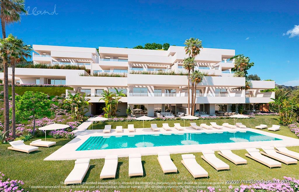 In den ruhigen Hügeln von Ojén, nur wenige Minuten von Marbella entfernt, befindet sich diese geschlossene Apartmentanlage in einzigartiger Lage mit beeindruckendem Blick auf das Mittelmeer. Umgeben von den geschützten Landschaften des Nationalparks Sierra de las Nieves verbindet die Anlage modernes Design mit der Natur und bietet einen ruhigen Rückzugsort in unmittelbarer Nähe zur lebendigen Küste der Costa del Sol.Die exklusive Wohnanlage besteht aus nur 22 hochwertigen Apartments, die mit Fokus auf Licht, Komfort und Ausblick gestaltet wurden. Die Wohnungen sind nach Süden ausgerichtet und verfügbar mit 2 oder 3 Schlafzimmern. Sie bieten offene Wohn- und Essbereiche mit integrierten Küchen. Große Schiebetüren verbinden das Innere mit geräumigen Terrassen – einige mit bis zu 52 m² – ideal für Mahlzeiten im Freien oder zum Entspannen mit Panoramablick auf das Meer. Das Hauptschlafzimmer verfügt über ein eigenes Bad und einen begehbaren Kleiderschrank.Die Anlage bietet zahlreiche gemeinschaftliche Annehmlichkeiten wie einen Swimmingpool, einen Grillplatz, Chill-out-Zonen, eine Kamin-Lounge und eine Getränke-Ecke. Zudem haben die Bewohner Zugang zu einem privaten Clubhaus mit Coworking-Bereich, Fitnessraum, Sauna, Innenpool, Sonnenterrasse und Veranstaltungsräumen. Die übergeordnete Wohnanlage bietet darüber hinaus 24-Stunden-Sicherheitsdienst, einen lokalen Bauernmarkt, einen Tennisplatz, ein Spa, ein Reitzentrum, Picknickplätze und einen Kinderspielplatz.Jedes Apartment verfügt über einen Parkplatz, einen Abstellraum, Klimaanlage und Haushaltsgeräte und ist hochwertig ausgestattet. Diese Wohnanlage ist ideal für alle, die naturnahes, ruhiges und modernes Wohnen in Küstennähe suchen – ob für den Urlaub oder das ganze Jahr.