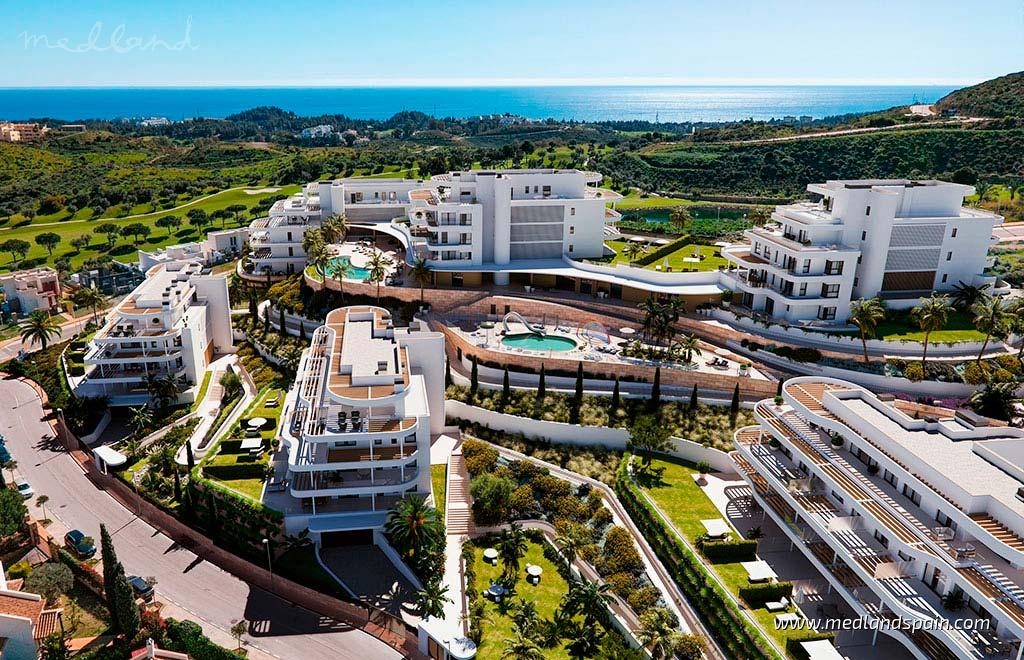 Diese modernen Apartments in Mijas Costa liegen in privilegierter Lage an der Costa del Sol, direkt am Golfplatz und nur 10 Autominuten vom Strand entfernt. Dank der Nähe zu Málaga, Marbella, Benalmádena und Fuengirola sowie nur 25 Minuten zum Flughafen Málaga ist diese Wohnanlage ideal als Zweitwohnsitz oder zur ganzjährigen Nutzung geeignet.Die Apartments bieten einen herrlichen 180°-Panoramablick auf das Meer, die umliegenden Berge und die Stadt. Die Gemeinschaftsanlage im Resort-Stil umfasst zahlreiche Freizeitbereiche wie einen Außenpool, ein beheiztes Hallenbad, ein Fitnessstudio, einen Yoga-Bereich sowie ein Spa mit Whirlpool, Sauna und Hammam. Es gibt außerdem einen Coworking-Bereich, eine Gastrobar, Spielzonen für Kinder und großzügige Gartenflächen.Alle Wohnungen sind modern gestaltet, mit offenen Grundrissen, viel Tageslicht und großzügigen Terrassen. Die Erdgeschosswohnungen verfügen zusätzlich über einen privaten Garten. Die Küchen sind mit Elektrogeräten ausgestattet, die Schlafzimmer verfügen über elektrische Rollläden, in den Bädern gibt es Fußbodenheizung. Jede Wohnung hat einen Abstellraum sowie einen Stellplatz in der Tiefgarage.Bis auf die 1-Zimmer-Wohnung verfügen alle Hauptschlafzimmer über ein eigenes Bad. Das Projekt ist BREEAM-zertifiziert und bietet eine App zur einfachen Verwaltung von Serviceleistungen der Wohngemeinschaft. Zudem ist eine Vorinstallation für Ladestationen von Elektrofahrzeugen vorhanden.Unsere Auswahl an Apartments in Mijas Costa verbindet hochwertiges Wohnen, beeindruckende Aussichten und eine einzigartige Lage direkt am Golfplatz.