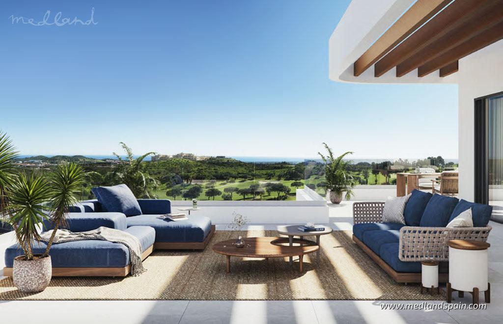 Diese modernen Apartments in Mijas Costa liegen in privilegierter Lage an der Costa del Sol, direkt am Golfplatz und nur 10 Autominuten vom Strand entfernt. Dank der Nähe zu Málaga, Marbella, Benalmádena und Fuengirola sowie nur 25 Minuten zum Flughafen Málaga ist diese Wohnanlage ideal als Zweitwohnsitz oder zur ganzjährigen Nutzung geeignet.Die Apartments bieten einen herrlichen 180°-Panoramablick auf das Meer, die umliegenden Berge und die Stadt. Die Gemeinschaftsanlage im Resort-Stil umfasst zahlreiche Freizeitbereiche wie einen Außenpool, ein beheiztes Hallenbad, ein Fitnessstudio, einen Yoga-Bereich sowie ein Spa mit Whirlpool, Sauna und Hammam. Es gibt außerdem einen Coworking-Bereich, eine Gastrobar, Spielzonen für Kinder und großzügige Gartenflächen.Alle Wohnungen sind modern gestaltet, mit offenen Grundrissen, viel Tageslicht und großzügigen Terrassen. Die Erdgeschosswohnungen verfügen zusätzlich über einen privaten Garten. Die Küchen sind mit Elektrogeräten ausgestattet, die Schlafzimmer verfügen über elektrische Rollläden, in den Bädern gibt es Fußbodenheizung. Jede Wohnung hat einen Abstellraum sowie einen Stellplatz in der Tiefgarage.Bis auf die 1-Zimmer-Wohnung verfügen alle Hauptschlafzimmer über ein eigenes Bad. Das Projekt ist BREEAM-zertifiziert und bietet eine App zur einfachen Verwaltung von Serviceleistungen der Wohngemeinschaft. Zudem ist eine Vorinstallation für Ladestationen von Elektrofahrzeugen vorhanden.Unsere Auswahl an Apartments in Mijas Costa verbindet hochwertiges Wohnen, beeindruckende Aussichten und eine einzigartige Lage direkt am Golfplatz.