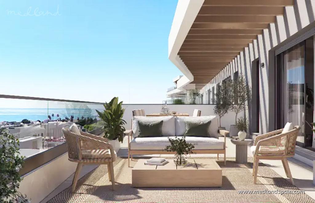 Diese modernen Apartments in Estepona befinden sich in der gefragten Wohngegend, die als Neue Goldene Meile bekannt ist, an der westlichen Costa del Sol. Dieses etablierte Umfeld entwickelt sich kontinuierlich weiter und überzeugt durch ein breites Angebot an Dienstleistungen, die Nähe zu mehreren Golfplätzen und Yachthäfen sowie eine gute Anbindung an Freizeit-, Kultur- und Gastronomieangebote. Hier entsteht ein ausgewogenes Zusammenspiel aus Ruhe und Alltagstauglichkeit, ideal sowohl für den dauerhaften Wohnsitz als auch für längere Aufenthalte an der Küste.Das Wohnprojekt umfasst Apartments mit 2 oder 3 Schlafzimmern, die durch eine durchdachte Raumaufteilung überzeugen und auf Helligkeit, Großzügigkeit und fließende Übergänge zwischen Innen- und Außenbereichen ausgelegt sind. Die Erdgeschosswohnungen verfügen über eigene Gartenbereiche, die den Wohnraum nach draußen erweitern, während sich die Penthäuser durch ihre großzügige Dachterrasse auszeichnen, die ganzjährig zum Entspannen im mediterranen Klima einlädt. Je nach Höhe und Ausrichtung bieten die oberen Etagen und die Penthäuser einen offenen Blick in Richtung Mittelmeer.Die Innenräume verbinden Funktionalität mit Wohnkomfort. Die offenen Küchen sind mit Elektrogeräten ausgestattet und fügen sich harmonisch in den Wohnbereich ein. Die Badezimmer sind vollständig ausgestattet, wobei das Hauptbad über ein Doppelwaschbecken verfügt. Eine Klimaanlage sorgt das ganze Jahr über für angenehme Temperaturen. Große Fensterflächen lassen viel Tageslicht in die Räume und schaffen helle, flexible Wohnbereiche, die sich sowohl für den Alltag als auch für gesellige Anlässe eignen.Die Gemeinschaftsbereiche wurden mit Blick auf ein ausgewogenes und praktisches Lebenskonzept gestaltet. Gepflegte Gartenanlagen mit wassersparender Bepflanzung bilden ein attraktives und leicht zu pflegendes Umfeld. Ergänzt wird das Angebot durch einen Gemeinschaftspool, einen Fitnessraum und einen Coworking-Bereich. Ein Gemeinschaftsraum, ein Fahrradstellbereich und ein Recyclingpunkt runden die Einrichtungen ab und sorgen für Ordnung und Komfort innerhalb der Anlage.Der Strand liegt rund 1,3 km entfernt und ist in etwa 5 Autominuten erreichbar. Das Zentrum von Estepona befindet sich ebenfalls nur etwa 10 Minuten entfernt. In der Umgebung finden sich Einkaufszentren, Golfplätze, Yachthäfen sowie ein vielfältiges kulturelles und gastronomisches Angebot. Der Flughafen Málaga–Costa del Sol liegt ungefähr 70 km entfernt und bietet bequeme nationale und internationale Verbindungen.