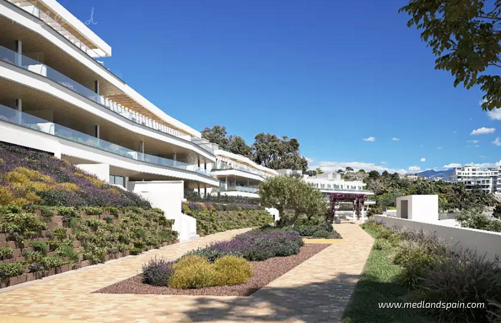 Diese modernen Apartments in Estepona befinden sich in der gefragten Wohngegend, die als Neue Goldene Meile bekannt ist, an der westlichen Costa del Sol. Dieses etablierte Umfeld entwickelt sich kontinuierlich weiter und überzeugt durch ein breites Angebot an Dienstleistungen, die Nähe zu mehreren Golfplätzen und Yachthäfen sowie eine gute Anbindung an Freizeit-, Kultur- und Gastronomieangebote. Hier entsteht ein ausgewogenes Zusammenspiel aus Ruhe und Alltagstauglichkeit, ideal sowohl für den dauerhaften Wohnsitz als auch für längere Aufenthalte an der Küste.Das Wohnprojekt umfasst Apartments mit 2 oder 3 Schlafzimmern, die durch eine durchdachte Raumaufteilung überzeugen und auf Helligkeit, Großzügigkeit und fließende Übergänge zwischen Innen- und Außenbereichen ausgelegt sind. Die Erdgeschosswohnungen verfügen über eigene Gartenbereiche, die den Wohnraum nach draußen erweitern, während sich die Penthäuser durch ihre großzügige Dachterrasse auszeichnen, die ganzjährig zum Entspannen im mediterranen Klima einlädt. Je nach Höhe und Ausrichtung bieten die oberen Etagen und die Penthäuser einen offenen Blick in Richtung Mittelmeer.Die Innenräume verbinden Funktionalität mit Wohnkomfort. Die offenen Küchen sind mit Elektrogeräten ausgestattet und fügen sich harmonisch in den Wohnbereich ein. Die Badezimmer sind vollständig ausgestattet, wobei das Hauptbad über ein Doppelwaschbecken verfügt. Eine Klimaanlage sorgt das ganze Jahr über für angenehme Temperaturen. Große Fensterflächen lassen viel Tageslicht in die Räume und schaffen helle, flexible Wohnbereiche, die sich sowohl für den Alltag als auch für gesellige Anlässe eignen.Die Gemeinschaftsbereiche wurden mit Blick auf ein ausgewogenes und praktisches Lebenskonzept gestaltet. Gepflegte Gartenanlagen mit wassersparender Bepflanzung bilden ein attraktives und leicht zu pflegendes Umfeld. Ergänzt wird das Angebot durch einen Gemeinschaftspool, einen Fitnessraum und einen Coworking-Bereich. Ein Gemeinschaftsraum, ein Fahrradstellbereich und ein Recyclingpunkt runden die Einrichtungen ab und sorgen für Ordnung und Komfort innerhalb der Anlage.Der Strand liegt rund 1,3 km entfernt und ist in etwa 5 Autominuten erreichbar. Das Zentrum von Estepona befindet sich ebenfalls nur etwa 10 Minuten entfernt. In der Umgebung finden sich Einkaufszentren, Golfplätze, Yachthäfen sowie ein vielfältiges kulturelles und gastronomisches Angebot. Der Flughafen Málaga–Costa del Sol liegt ungefähr 70 km entfernt und bietet bequeme nationale und internationale Verbindungen.