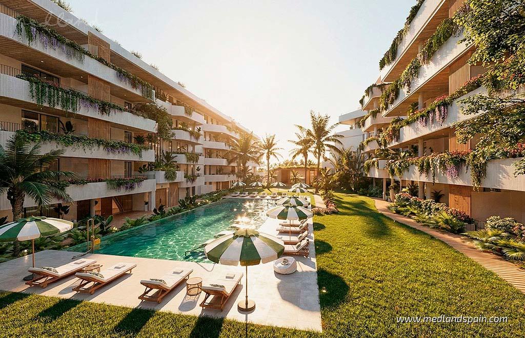 Diese Apartments in San Pedro de Alcántara befinden sich in Marbella West, einem aufstrebenden Wohngebiet an der Costa del Sol, das sich aktuell stark wandelt und zunehmend an Bedeutung gewinnt. Nur wenige Autominuten von Puerto Banús entfernt entwickelt sich hier ein modernes Umfeld, geprägt von neuen Wohnprojekten und einem geplanten Hotel, das sowohl für den dauerhaften Wohnsitz als auch als Zweitwohnsitz immer attraktiver wird.Die Wohnanlage bietet eine Auswahl an Apartments mit 1 bis 4 Schlafzimmern, verteilt auf verschiedene Grundrisse, die sich an unterschiedliche Lebensstile anpassen. Alle Wohnungen verfügen über großzügige Terrassen, die den Wohnraum nach außen erweitern und das mediterrane Klima optimal nutzbar machen. Ausgewählte Apartments sind zusätzlich mit einem privaten Pool ausgestattet und bieten ein erhöhtes Maß an Komfort. Besonders hervorzuheben sind die Duplex-Penthäuser, die sich durch ihre großzügigen Proportionen auszeichnen und über zwei Terrassen sowie einen privaten Pool verfügen, wodurch ein angenehmes Wohnen im Freien das ganze Jahr über möglich ist. Die Wohnungen sind hell und ausgewogen gestaltet, mit großen Fensterflächen und durchdachten Raumaufteilungen, die viel Tageslicht und ein angenehmes Wohngefühl schaffen. In allen Grundrissen, mit Ausnahme des Modells mit 1 Schlafzimmer, verfügt das Hauptschlafzimmer über ein eigenes Bad sowie einen geräumigen Ankleidebereich.Die Innenräume sind auf zeitgemäßes Wohnen ausgerichtet und verbinden Funktionalität mit Komfort. Jede Wohnung verfügt über eine offene Küche mit integrierten Elektrogeräten, eine Klimaanlage mit Luftkanälen sowie vollständig ausgestattete Badezimmer. Ein Tiefgaragenstellplatz und ein Abstellraum sind im Angebot enthalten und sorgen für zusätzlichen Komfort im Alltag, unabhängig davon, ob die Immobilie als Hauptwohnsitz oder als Feriendomizil genutzt wird.Die Gemeinschaftsbereiche sind so konzipiert, dass sie ein wohnliches Umfeld mit Resort-Charakter schaffen, in dem Wohlbefinden und Entspannung im Mittelpunkt stehen. Gepflegte Gartenanlagen bilden einen grünen Rahmen um den Außenpool und schaffen eine ruhige Atmosphäre. Ergänzt wird das Angebot durch einen Wellnessbereich mit Fitnessraum, beheiztem Innenpool und Spa-Zonen, die ganzjährig genutzt werden können. Gemeinschaftliche Freizeit- und Aufenthaltsbereiche sowie speziell gestaltete Zonen für Kinder unterstützen ein angenehmes Zusammenleben. Die Dachbereiche bieten zusätzliche Gemeinschaftsflächen mit Skypool, Sonnenterrassen und einem Yoga-Bereich, die einen ruhigen Rückzugsort über der Anlage schaffen.San Pedro de Alcántara verfügt über ein breites Angebot an Geschäften, Restaurants, Sporteinrichtungen und internationalen Schulen in der näheren Umgebung. Der Strand liegt etwa 1,2 km entfernt und ist in rund 5 Minuten erreichbar, während der Flughafen Málaga in etwa 45 Minuten zu erreichen ist. Insgesamt verbinden diese Apartments eine gut angebundene Lage mit einer Vielfalt an Wohnmodellen und sorgfältig gestalteten Gemeinschaftsbereichen - eine attraktive Option für modernes Wohnen in Marbella West.