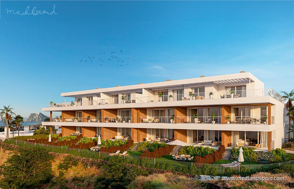 Residencial de apartamentos en primera línea de golf y a 2 km de la playa en San Roque. Este municipio de Cádiz, en la frontera con Málaga, ofrece todo lo necesario para el día a día, como colegios, supermercados, centros comerciales, bancos y restaurantes, además de unas bonitas y largas playas de arena blanca. La zona es conocida por sus fantásticos campus de golf, además de ofrecer bonitos parques naturales, rutas de senderismo, clubs de Polo y puertos deportivos. Desde el residencial es fácil y rápido llegar a otros puntos de interés, tanto de la provincia de Cádiz como de Málaga. Se puede llegar a Sotogrande en solo 15 minutos, a Manilva en 30 minutos y a Marbella en 45 minutos.El proyecto está compuesto por viviendas de 2, 3 o 4 dormitorios, disponibles en varios modelos; plantas bajas con jardín privado, apartamentos dúplex, plantas intermedias y áticos. Según orientación, las viviendas ofrecen vistas panorámicas al campo de golf y/o al mar. Todos los modelos disponen de una amplia zona de día, combinando salón, comedor y cocina en un único espacio con acceso a la terraza. El dormitorio principal dispone de baño en suite y acceso a la terraza. En el modelo dúplex, el dormitorio principal está ubicado en la planta superior con terraza privada. Las viviendas están construidas con las mejores calidades e incluyen aire acondicionado por conductos (frío/calor), sistema domótico, suelo radiante en el baño principal, cocina totalmente equipada con electrodomésticos y 1 o 2 plazas de garaje, según modelo.El residencial está totalmente cerrado y ofrece fantásticas instalaciones para sus futuros residentes, destacando la gran piscina infinity, gimnasio interior y exterior, vestuarios y aseos, kiosko, sauna, espacio coworking, sala multiuso y aparcamiento para bicicletas.
