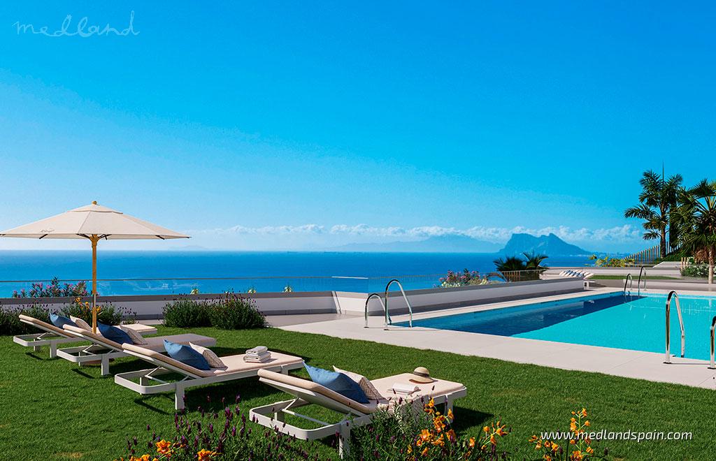 Nuevo proyecto residencial de viviendas adosadas situado en Manilva. Construido sobre una parcela elevada, el complejo ofrece unas espectaculares vistas al mar y al estrecho de Gibraltar. Una ubicación privilegiada, en la frontera entre las provincias de Cádiz y Málaga, rodeado de varios campos de golf, como La Duquesa, Doña Julia y el Real Club de Valderrama, cerca de todos los servicios y de fabulosas playas. Además, a poca distancia se encuentran dos importantes puertos deportivos de la zona, La Duquesa y Sotogrande, con todo tipo de actividades acuáticas disponibles. Gracias a la magnífica conexión por la autovía A-7 se llega rápidamente a otros importantes enclaves turísticos de la Costa del Sol, como a Estepona en 30 minutos y a Marbella en 40 minutos. El aeropuerto de Gibraltar se encuentra a solamente 35 minutos del residencial. Una ubicación ideal, tanto para los que buscan una vivienda de vacaciones o como para vivir todo el año.Conjunto de modernos adosados, disponibles en 3 dormitorios con 2 baños y 4 dormitorios con 3 baños. Todos modelos ofrecen preciosas vistas panorámicas al mar y amplias terrazas. Algunas viviendas de 3 dormitorios tienen jardín privado y las viviendas de esquina incluyen además piscina privada. Las viviendas presentan diferentes distribuciones con una zona de día de diseño abierto, combinando salón, comedor y cocina en un amplio espacio con acceso a una terraza. Los modelos de 3 dormitorios tienen un aseo de invitados en la planta donde está la zona del día. El dormitorio principal cuenta con baño en suite y en algunos modelos tiene además acceso a una terraza.Las viviendas están construidas con los mejores materiales e incluyen cocina completamente equipada con electrodomésticos, instalación de aire acondicionado por conductos y con bomba de calor (refrigeración y calefacción), sistema de aerotermia y video portero electrónico con receptor de llamada e imagen a color. Todas las viviendas tienen incluidas una plaza de aparcamiento, algunos modelos tienen una plaza subterránea.El residencial está completamente cerrado y ofrece varias zonas comunes, destacando la gran piscina de cloración salina de tipo infinity, zonas ajardinadas con áreas de paseo y zona de descanso con tumbonas y la Casa Club con spa, gimnasio y salón comunitario.