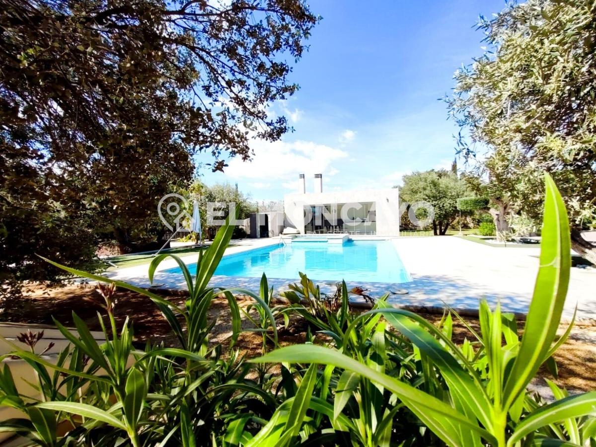 El Moncayo Propertes pone a la venta este fantástico e impresionante chalet independiente entre las localidades de Elche y Crevillente.Esta impresionante finca rústica cuenta con 2700m2 aproximados de parcela con amplias zonas ajardinadas, piscina privada, cocina exterior con barbacoa, trastero, parking techado para guardar vehículos con cargador para coches eléctricos, un baño exterior completo con plato de ducha, lavabo e inodoro y caseta de madera con gimnasio.