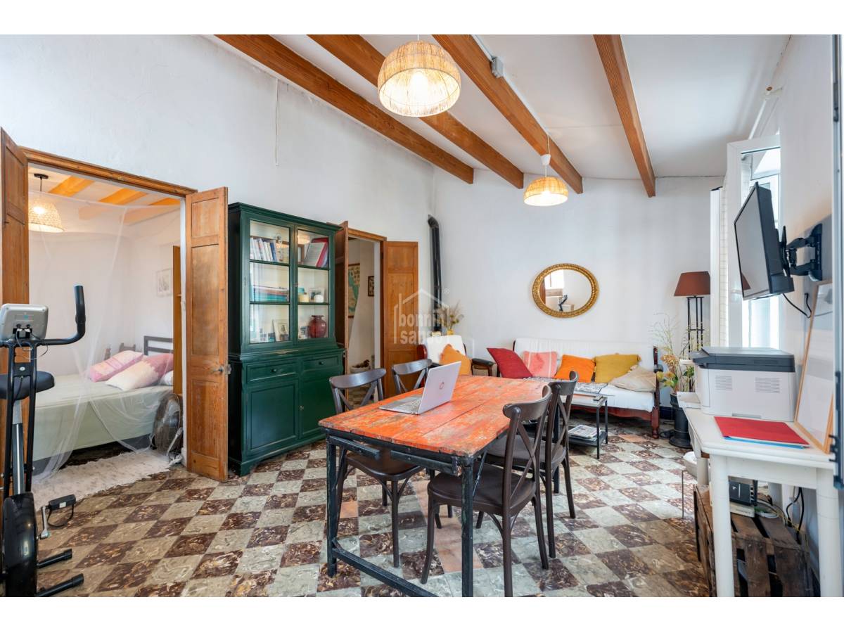Cette maison typique se distingue par sa distribution singulière et son charme d'origine, alliant confort et caractère dans chaque recoin.En entrant dans la maison, on trouve la cuisine, puis un escalier mène à un agréable salon-salle à manger avec de hauts plafonds, poutres apparentes et sols en carreaux hydrauliques d'origine.