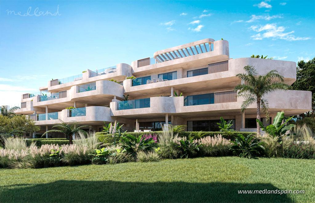 Nowoczesny kompleks apartamentów w nowo wybudowanej dzielnicy Estepony, oferujący idealne połączenie spokoju, ekskluzywności i bliskości wszystkich niezbędnych usług.Otoczony prestiżowymi polami golfowymi, takimi jak Estepona Golf, Azata Golf i Valle Romano Golf Club, i zaledwie 5 minut jazdy od plaży, co czyni go idealnym miejscem do cieszenia się śródziemnomorskim stylem życia. Centrum Estepony jest oddalone o 10 minut, z tętniącym życiem starym miastem, przystanią, oraz wieloma restauracjami i zajęciami rekreacyjnymi.Doskonała sieć dróg, z autostradą A-7, łączy się z Marbellą i Puerto Banús w 30 minut, a lotniska w Maladze i Gibraltarze oddalone są o niecałą godzinę drogi.Ten butikowy kompleks oferuje nowoczesne apartamenty z 2, 3 i 4 sypialniami, zaprojektowane z przestronnymi wnętrzami, tarasami i dużymi oknami maksymalizującymi naturalne światło. Apartamenty dostępne w:Modelach na parterze z prywatnymi ogrodamiModelach na pierwszym piętrze z przestronnymi tarasamiPenthousy z imponującymi solariami i panoramicznymi widokamiDwupoziomowe penthousy z dużymi tarasami, oferujące większą prywatność w głównej sypialniApartamenty charakteryzują się eleganckim designem i wysokiej jakości wykończeniami, w tym w pełni wyposażonymi kuchniami ze sprzętem AGD i klimatyzacją kanałową.