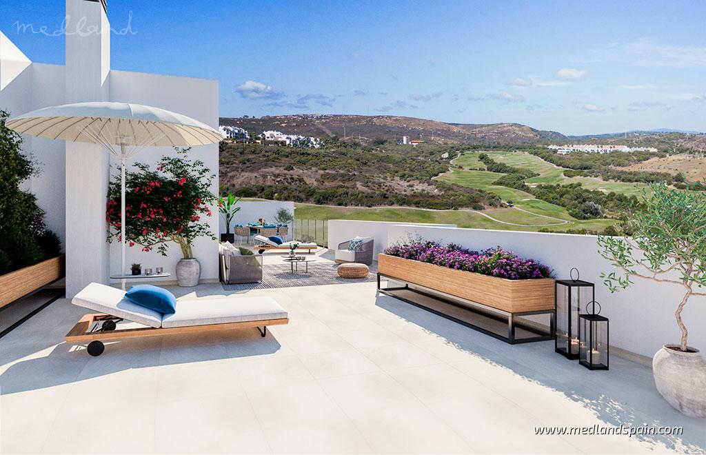 Kompleks golfowy w Pierwszej Linii, bardzo blisko plaży w San Roque. Jest to idealna okolica pomiędzy prowincjami Kadyks i Malaga, z szerokim wyborem artykułów codziennego użytku i tylko 5 minut jazdy samochodem od bajecznych plaż. Prowincja Kadyks znana jest nie tylko z ekskluzywnych pól golfowych, ale także z pięknych parków przyrody, szlaków turystycznych, klubów polo i przystani. Dobra sieć dróg umożliwia szybkie dotarcie do innych atrakcji turystycznych, takich jak Sotogrande w 15 minut, Manilva w 30 minut i Marbella w 45 minut.W skład kompleksu wchodzą apartamenty z 2 i 3 sypialniami, dostępne w różnych modelach: modele na parterze z prywatnym ogródkiem, modele na pierwszym piętrze, modele na dwóch piętrach z tarasem oraz penthouse z 3 sypialniami i dużym tarasem. Wszystkie apartamenty oferują panoramiczny widok na pole golfowe i obejmują jasną część dzienną na otwartym planie, która wychodzi na taras. Główna sypialnia posiada własną łazienkę oraz wyjście na taras. Główna sypialnia, w modelach dwupoziomowych, znajduje się na najwyższym piętrze i posiada prywatny taras. Niektóre modele mają także boczny widok na morze.Apartamenty te charakteryzują się doskonałymi cechami, takimi jak klimatyzacja kanałowa, w pełni wyposażona kuchnia ze sprzętem AGD, kompletne łazienki, pomieszczenie do przechowywania oraz 1 lub 2 miejsca parkingowe, w zależności od modelu.Osiedle jest całkowicie zamknięte, co gwarantuje bezpieczeństwo jego mieszkańcom, z zapleczem ogólnodostępnym obejmującym basen, strefy relaksu z leżakami, przestrzenie ogrodowe, toalety, gastro-bar i parking dla wózków.