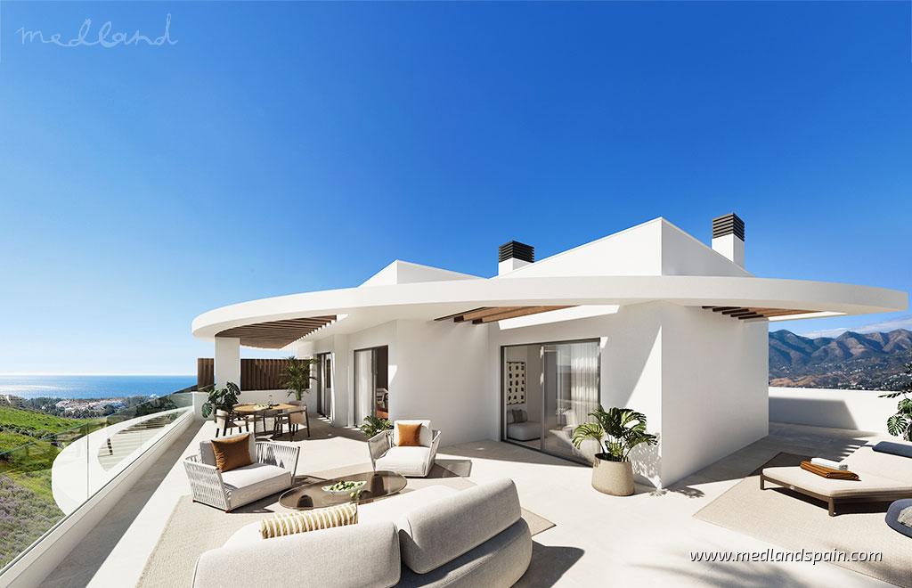 Te apartamenty położone są w podwyższonej i spokojnej lokalizacji na terenie renomowanego resortu golfowego w zachodniej części Costa del Sol, oferując otwarte widoki na Morze Śródziemne oraz uprzywilejowane położenie w otoczeniu naturalnego krajobrazu i pól golfowych. Okolica zapewnia wyraźne poczucie przestrzeni i prywatności, połączone ze spokojną atmosferą blisko natury, a jednocześnie z wygodnym dostępem do wybrzeża. Plaża znajduje się około 10 minut jazdy samochodem, natomiast centra La Cala de Mijas i Fuengirola oddalone są o około 15 minut i oferują szeroki wybór restauracji, sklepów, obiektów sportowych oraz codziennych usług. Miasto Málaga i Marbella położone są w odległości około 30 minut, a międzynarodowe lotnisko w Máladze można osiągnąć w około 25 minut jazdy.Budynki mieszkalne są niskiej zabudowy i starannie wkomponowane w golfowe i naturalne otoczenie, dzięki czemu architektura harmonijnie współgra z ukształtowaniem terenu. Projekt obejmuje apartamenty z 1, 2 i 3 sypialniami, w tym lokale na parterze, piętrach pośrednich oraz penthouse’y. Każde mieszkanie zostało zaprojektowane z myślą o optymalnym wykorzystaniu orientacji, naturalnego światła i otwartych widoków w kierunku Morza Śródziemnego. Wszystkie nieruchomości posiadają przestronne tarasy stanowiące przedłużenie strefy dziennej, natomiast penthouse’y wyróżniają się wyjątkowo dużymi tarasami, idealnymi do korzystania z przestrzeni zewnętrznych przez cały rok. Układy wnętrz są przestronne i dobrze wyważone, z otwartymi kuchniami połączonymi z główną częścią dzienną.Wnętrza zostały zaprojektowane z naciskiem na codzienny komfort i funkcjonalność, łącząc wysokiej jakości materiały z starannie dobranymi wykończeniami. Każdy apartament wyposażony jest w klimatyzację, kuchnię z pełnym wyposażeniem AGD oraz w pełni urządzone łazienki z ogrzewaniem podłogowym. Technologia Smart Home umożliwia sterowanie kluczowymi systemami za pomocą urządzenia mobilnego, zwiększając wygodę użytkowania. Do każdego lokalu przynależy miejsce parkingowe oraz komórka lokatorska.Projekt zajmuje działkę o łącznej powierzchni 20.000 m², na której budynki i wspólne przestrzenie zewnętrzne rozmieszczono w sposób zapewniający poczucie otwartości i harmonii z naturalnym otoczeniem. Części wspólne zaprojektowano jako tereny zielone sprzyjające relaksowi i dobremu samopoczuciu, z basenem infinity jako centralnym elementem i otwartymi widokami na morze. Ogrody, strefy relaksu, siłownia oraz przestrzeń coworkingowa do pracy i spotkań dopełniają całości, tworząc zrównoważone środowisko, w którym golf, natura i współczesny komfort łączą się w naturalny sposób.