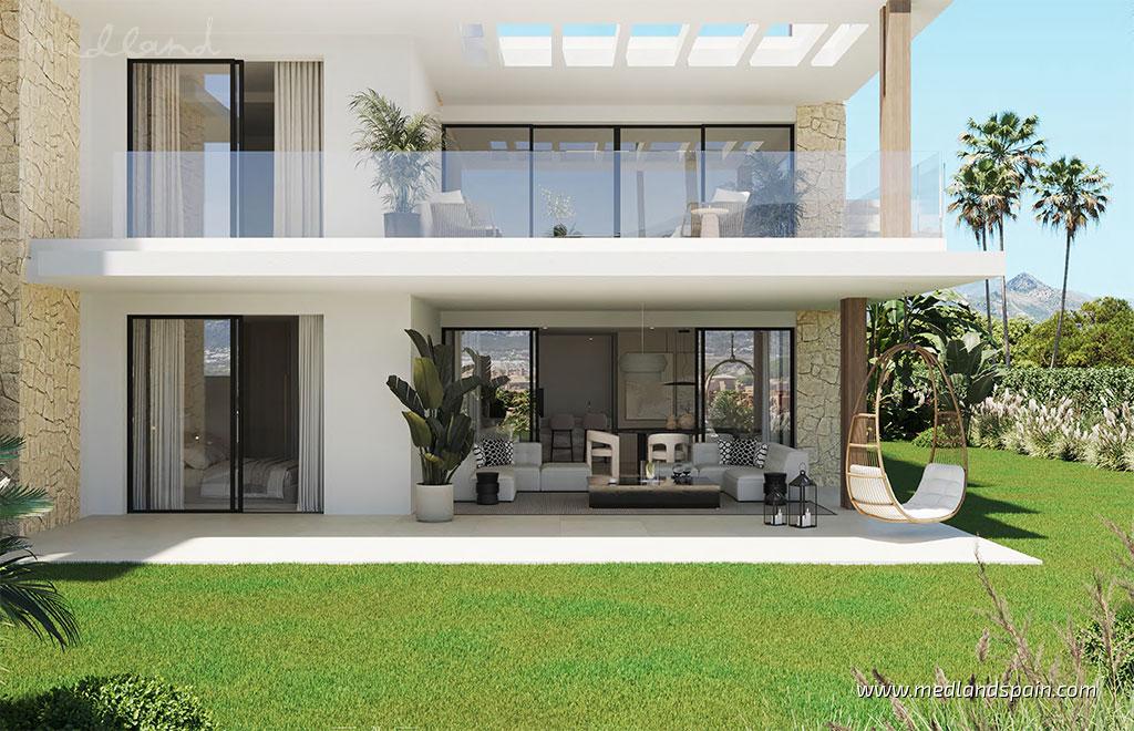 Nowy projekt ekskluzywnych apartamentów z fantastycznym widokiem na morze, tylko 15 minut od Estepony. Ten szybko rozwijający się obszar, znany jako "Nowa Złota Mila", otoczony jest pięknym środowiskiem naturalnym, prestiżowymi polami golfowymi i zaledwie 10 minut jazdy samochodem od spektakularnych plaż. "Złoty trójkąt", w skład którego wchodzą Marbella, Benahavis i Estepona, oferuje wszystkie usługi w niewielkiej odległości, a także portu i luksusowe centra handlowe. Doskonała sieć dróg łączy projekt z Puerto Banús w 20 minut, centrum Marbelli w 25 minut, a międzynarodowe lotnisko w Maladze w nieco ponad godzinę.Projekt prezentuje nowoczesne apartamenty, rozmieszczone w różnych budynkach po trzy piętra każdy, i są dostępne w różnych modelach: modele na parterze z 2 lub 3 sypialniami i prywatnym ogrodem, modele na pierwszym piętrze z 2 sypialniami i dużymi tarasami, penthousy na dwóch piętrach z 4 sypialniami oraz penthousy z 3 sypialniami i prywatnym solarium, niektóre z prywatnym basenem. Podwyższona działka sprawiła, że ze wszystkich apartamentów roztacza się wspaniały widok na Morze Śródziemne i góry. Apartamenty te charakteryzują się dużymi tarasami i projektem otwartych przestrzeni, co zapewnia doskonałą integrację między wnętrzem a zewnętrzem.Apartamenty posiadają wysokiej jakości wykończenia, a także kuchnie w pełni wyposażone w sprzęt AGD, klimatyzację kanałową, ogrzewanie podłogowe w całym budynku, pralnię ze zlewozmywakiem, system Smart Home, komórkę lokatorską i miejsce parkingowe na wspólnym parkingu. W zależności od etapu budowy możliwe jest dostosowanie niektórych wykończeń, a nawet dodanie prywatnego basenu za dodatkową opłatą.Kompleks mieszkalny jest całkowicie ogrodzony i posiada 24-godzinną recepcję oraz ochronę. Pomieszczenia ogólnodostępne zostały zaprojektowane z myślą o wspaniałym śródziemnomorskim klimacie, z dużymi ogrodami, dwoma odkrytymi basenami, siłownią, strefą SPA z krytym basenem, kawiarnią/barem z częścią coworkingową.