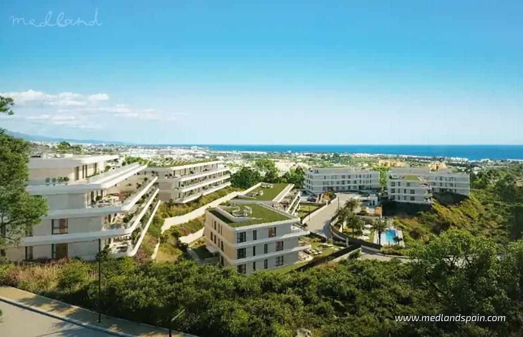 W podwyższonej części Estepony na Costa del Sol powstają te nowoczesne apartamenty, stworzone dla osób ceniących przestrzeń, światło oraz dopracowane części wspólne w pobliżu Morza Śródziemnego. Położone około 2 km od plaży i promenady, oferują otwarte widoki na morze i góry oraz bliskość pola golfowego. Centrum Estepony z mariną, restauracjami, sklepami i szkołami międzynarodowymi znajduje się w niewielkiej odległości jazdy samochodem, a lotnisko w Maladze oddalone jest o około 50 minut.Projekt obejmuje apartamenty z 3 i 4 sypialniami rozmieszczone w eleganckich, niskich budynkach, zaprojektowane z przestronnymi tarasami, które naturalnie przedłużają strefę dzienną na zewnątrz. Otwarte kuchnie są wyposażone w sprzęt AGD, a łazienki są w pełni wykończone w wysokim standardzie. Klimatyzacja oraz ogrzewanie podłogowe w całym apartamencie zapewniają komfort przez cały rok. Każdy lokal posiada 1 lub 2 miejsca parkingowe oraz komórkę lokatorską. Wybrane apartamenty na parterze dysponują ogrodem, natomiast penthouse’y oferują solarium z panoramicznymi widokami.Osiedle zostało zaprojektowane z myślą o jakości życia i obejmuje zagospodarowane tereny zielone, basen zewnętrzny oraz przestrzeń dla rowerów. Klub społeczny uzupełnia ofertę o podgrzewany basen wewnętrzny, siłownię, sauny, strefę coworkingową i gastrobar, tworząc idealne warunki zarówno do stałego zamieszkania, jak i dłuższych pobytów w andaluzyjskim klimacie.Atrakcyjna nadmorska lokalizacja łącząca nowoczesną architekturę, rozbudowane części wspólne oraz bliskość morza i pola golfowego.