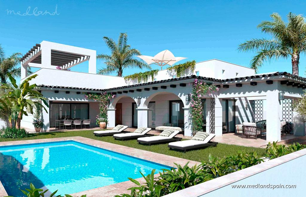Ta willa w stylu Hacienda z 3 sypialniami w Doña Pepa, Ciudad Quesada — jednej z najbardziej ugruntowanych dzielnic mieszkaniowych południowej Costa Blanca — łączy tradycyjny charakter z nowoczesnym wnętrzem. Nieruchomość została wybudowana na działce o powierzchni 450 m² i znajduje się zaledwie 10 minut jazdy samochodem od piaszczystych plaż Guardamar. Zadaszone strefy, eleganckie łuki oraz elementy pergoli podkreślają wyjątkowy charakter architektoniczny i tworzą nowoczesną przestrzeń do całorocznego zamieszkania.Dom jest rozplanowany na jednym poziomie. Układ koncentruje się wokół jasnej, otwartej przestrzeni dziennej, w której kuchnia, jadalnia i salon naturalnie się łączą. Duże przesuwne drzwi zapewniają maksymalny dopływ światła dziennego i płynne przejście do stref zewnętrznych. Wnętrza wykończono w wysokim standardzie, łącząc czyste linie architektoniczne z ciepłymi materiałami i zintegrowanym oświetleniem. Główna sypialnia posiada bezpośrednie wyjście na zewnątrz, a projekt stawia na prywatność, komfort i funkcjonalność w codziennym użytkowaniu.Strefa zewnętrzna została zaprojektowana z myślą o śródziemnomorskim stylu życia, z głównym tarasem i zacienionymi miejscami wokół domu, idealnymi do spożywania posiłków na świeżym powietrzu lub relaksu. Przestronne solarium stanowi podwyższoną przestrzeń do korzystania z klimatu, a ogród otacza prywatny basen i zapewnia miejsce parkingowe na działce dla maksymalnie 2 samochodów.Doña Pepa jest znana z kosmopolitycznej atmosfery i silnej społeczności międzynarodowej, z międzynarodowymi szkołami, centrami medycznymi, restauracjami i supermarketami w pobliżu. Obiekty sportowe, popularny park wodny oraz pole golfowe La Marquesa znajdują się w krótkiej odległości jazdy samochodem. Lotnisko w Alicante oddalone jest o około 35 minut jazdy, a lotnisko w Murcji o około 50 minut, co czyni tę lokalizację atrakcyjną zarówno do stałego zamieszkania, jak i na dłuższe pobyty.