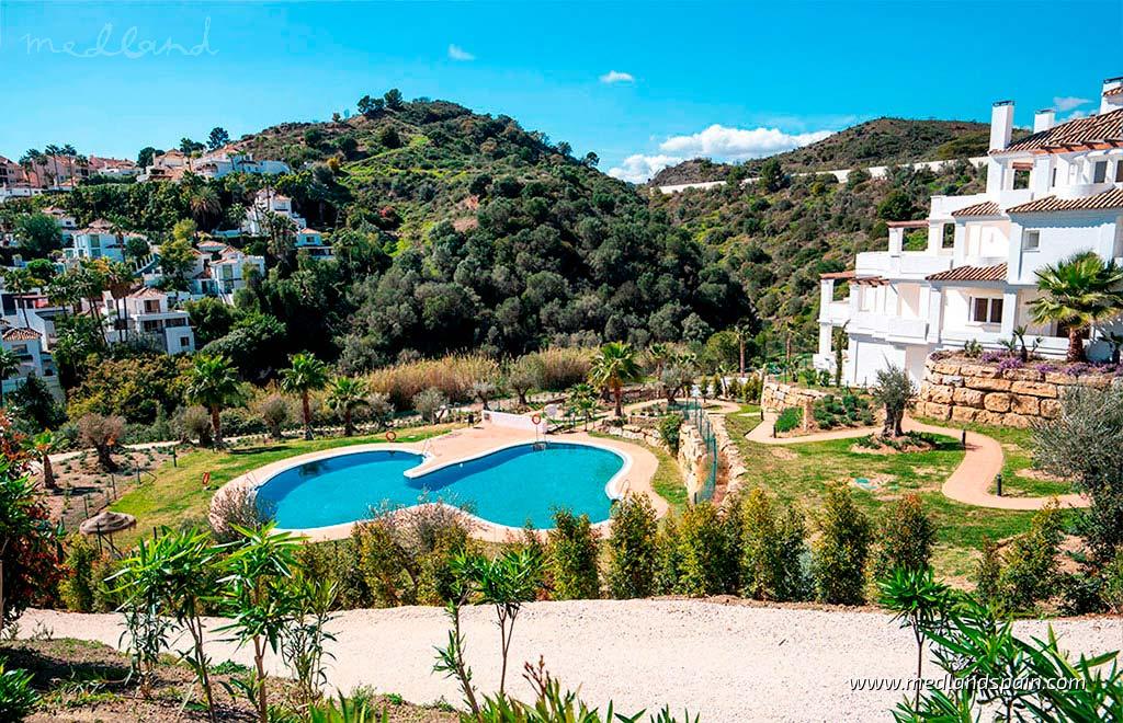 Apartments with sea views in the exclusive area of Nueva Andalucia, in Marbella. This residential complex is in an unbeatable location, close to all the basic services and with access to the best restaurants, entertainment venues, shopping centres and fantastic white sand beaches. The area is also perfect for golf enthusiasts, with serverals courses only a few minutes away, like Los Naranjos Golf Club and Aloha Golf Club. The good road network, with the AP-7 and A-7 motorways, makes it easy to reach other tourist locations, like the cosmopolitan Puerto Banus in 15 minutes, Marbella centre in 20 minutes, and the international airport of Malaga in 40 minutes. This is the ideal place to enjoy the pure Mediterranean lifestyle on the Costa del Sol.The complex has a Mediterranean-style design, offering beautiful, ready-to-move-in apartments with 2 and 3 bedrooms. The apartments offer panoramic sea views, with a southwest or southeast orientation, and are available in different models. It is possible to choose between ground floor and mid-floor models with spacious terraces, or penthouses on two floors with 2 bedrooms and two terraces. All models present and open plan living area, combining the kitchen, lounge and dining room into a single space, which opens onto the terrace. The master bedroom has a private bathroom and access to the terrace too. Te penthouse models have the master bedroom on the top floor with a private terrace.All apartments have luxury qualities and include a fully equipped kitchen, complete bathrooms, an air conditioning system, a storage room and an underground parking space.The complex has 24-hour security and offers fantastic community facilities, like two community pools, a sunbathing terrace, Mediterranean gardens, a fully equipped gym, a Zen space for relaxation, and gastro-bar for preparing meals.