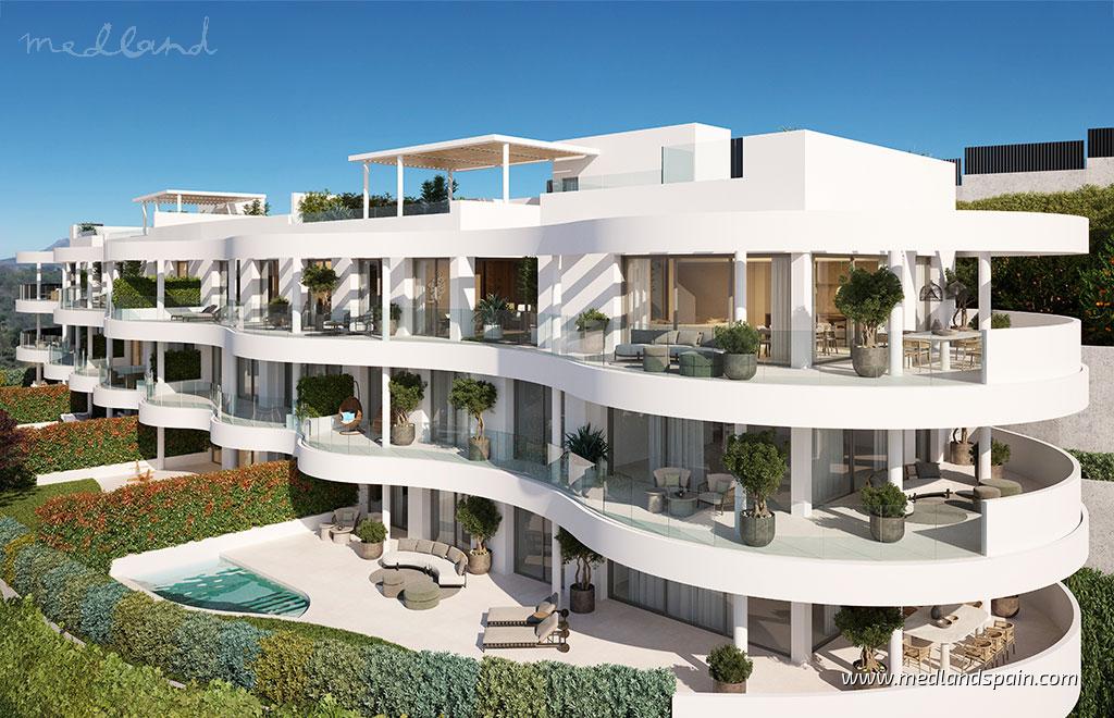 Exclusive complex of luxury apartments with fantastic panoramic sea views in Benahavis. An enviable location, just 15 minutes by car from Marbella and the cosmopolitan area of Puerto Banus, with its luxury shops, elegant restaurants, and one of the most famous marinas in Europe. The complex is perfectly located for golf enthusiasts, with various golf courses close by, including La Quinta Golf & Country, Los Arqueros Golf and Country Club, Los Naranjos Golf Club, and El Higueral Golf. The beautiful natural environment makes it an ideal area to enjoy adventure sports, as well as the beautiful beaches, where all forms of water sports are available. The good road connection makes it possible to reach other tourist areas, like the picturesque town of Estepona in 25 minutes, or Malaga, and its airport, in less than an hour.A project with an avant-garde and unique design, focusing on the incorporation of natural light and the impressive views of the entire coast and the Mediterranean. The exclusive apartments are available with 3 and 4 bedrooms, in a choice of models: ground floor models with a private garden; mid-floor models with a terrace; and penthouses with a private solarium.