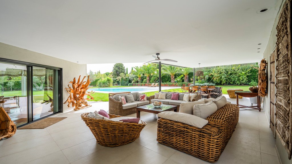 The layout of this villa is truly impressive. On the ground floor we find a hall with a storage room, a living room on two levels, a separate dining room, a kitchen with an office and a wine cellar, and a guest toilet. The bedroom area can be isolated by two armoured doors. There is also a living area connected to the master bedroom, which has a dressing room and bathroom. In addition, there is a games area connected to 3 en-suite bedrooms, one of them on two levels.