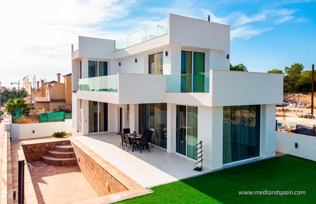 Exclusive complex of single-family homes in Villamartín, a residential area of Orihuela Costa on the Costa Blanca South. The project is only 5 minutes’ drive from the Villamartín plaza with a selection of entertainment facilities and restaurants, and only 10 minutes’ drive from the fabulous Zenia Boulevard with a hypermarket, a variety of well-known shops, and leisure activities for all ages. The area offers an extensive variety of outdoor sports activities, like four prestigious golf courses within a 20-minute drive, as well as tennis and padel, cycling, hiking, and water sports at the incredible Orihuela Costa beaches. The project is ideally situated between the Murcia and Alicante airports, which are both 50 minutes away.This project comprises a detached villa on a private plot of 329m2, as well as a separate community of terraced villas with a communal pool and garden, as well as underground parking and storage units.This Key Ready villa is distributed on two floors, with 3 bedrooms and 2 bathrooms, plus a solarium.
