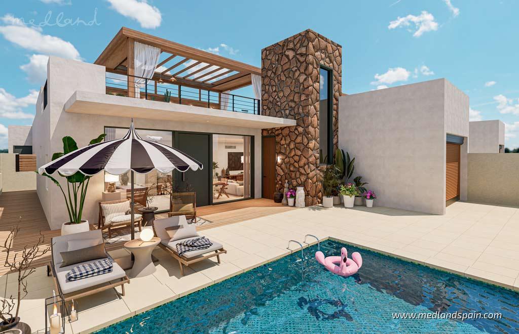 New residential complex in La Pinilla, an inland area belonging to the area of Fuente Álamo in Murcia. The area is 20 minutes' drive from Mazarrón and the beautiful beaches of the Costa Cálida. This is a rural area in a peaceful and natural environment, ideal for nature lovers, with a variety of hiking, cycling, and horse-riding trails in the surrounding mountains. The excellent road network connects the area to the larger cities of Cartagena and Murcia, which are 30-45 minutes away, respectively. Murcia airport is only 25 minutes away by car, while Alicante airport is less than 1,5hrs away.The project comprises modern homes, available in different models: apartments with 2 bedrooms and 2 bathrooms on the ground floor with a garden, or on the top floor with a private solarium; terraced villas on one level with 2 bedrooms, 2 bathrooms, and a private solarium; and detached villas with 3 bedrooms, 2-3 bathrooms, and a private solarium.All the homes present an open plan living area, combining the kitchen, dining area, and spacious lounge in a single space. The large windows in the lounge open onto a terrace, perfect for enjoying the pleasant Costa Cálida climate. The master bedrooms have a private bathroom.The project aims to promote an environmentally responsible community, by implementing eco-friendly materials and energy efficient technology. Each home includes pre-installation for ducted A/C, fitted wardrobes, and solar panels. It is possible to customise the home for an additional price, from a choice of extra upgrades, eg. building a salt-water pool in the garden of the villas.The complex is completely closed with controlled entry and 24hr surveillance. The exceptional community facilities are available for all residents to enjoy, like a commercial area with a supermarket, café, and shops, as well as various garden spaces, a sports area, a children’s playground, and a community centre for social events.