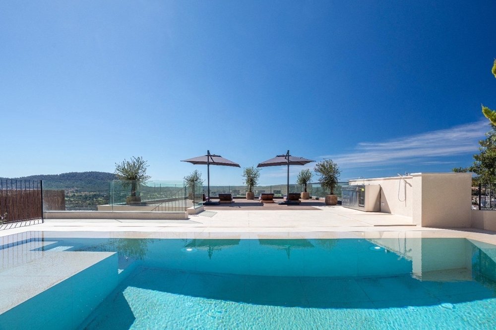 Luxury villa with magnificent views of the mountains and the sea in the quiet residential area of Santa Ponsa, a popular and well-known destination in the southwest of Mallorca. This absolute gem is located on the heights above the beach of Santa Ponsa. A 5-minute walk directly up from the beach offers tranquillity and wonderful panoramic views. This 2-storey new build villa was completed in 2024 and offers 162 m² of living space plus 150 m² of open and covered terraces. The house consists of an open plan living area with lounge, dining area and fully fitted open plan kitchen, 3 bedrooms and 3 bathrooms (one en suite). The luxury property benefits from a private pool and a terrace with seating area from where you can enjoy magnificent views and a semi-covered large terrace with outdoor kitchen and dining area. In the basement of the house there is a garage for 2 cars. The excellent villa is characterized by its high-quality equipment and furnishings, which have been finished down to the smallest detail.Central location close to supermarkets, restaurants, stores, tennis courts and a short drive to golf courses and country club with spa and wellness area, gym, tennis and paddle tennis courts and a restaurant. Energy certificate Type: in process