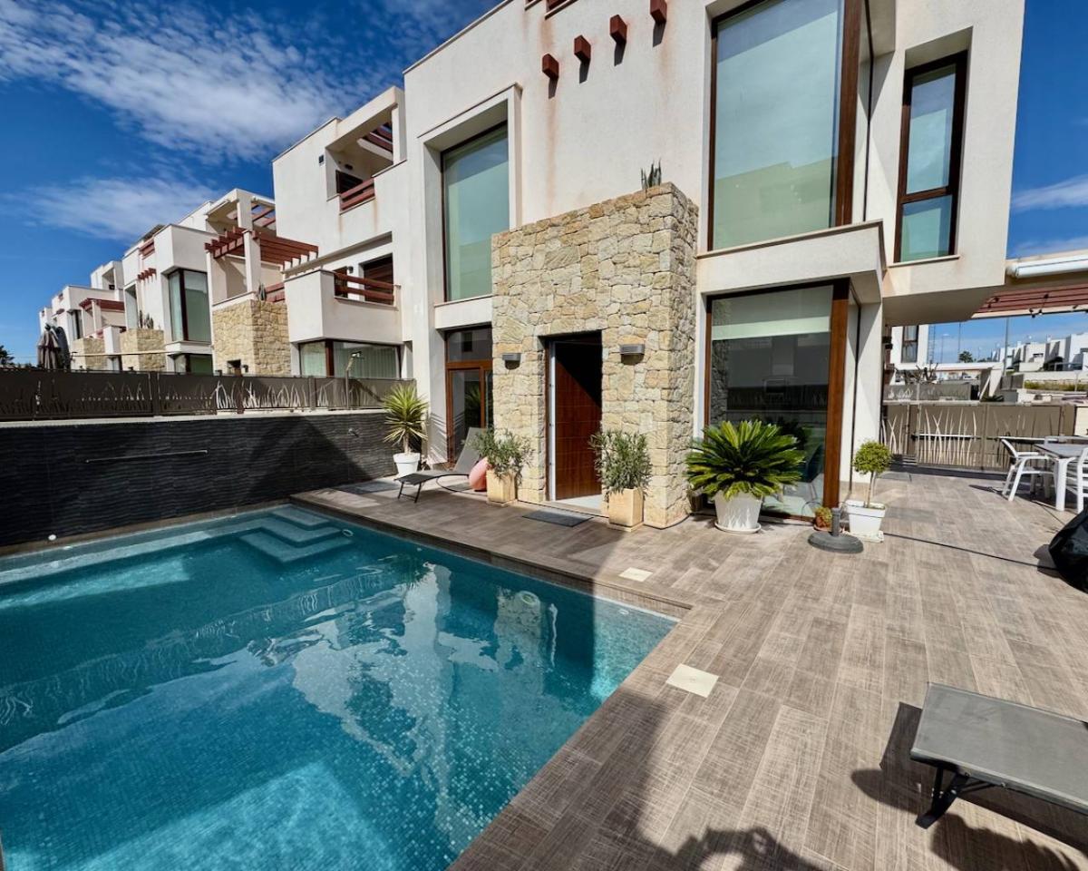 We are pleased to offer for sale this stylish new-build resale in showroom condition. With its impressive living space, walls of glass windows and views to the salt lakes this property offers something truly special. The villa is only a few years old and remains in perfect condition. The villa is set in a gated private road. As you enter into the property you find yourself in an L-shaped garden complete with pool, shaded covered seating area and room for parking. Move into the main living area and you cannot fail to be impressed by the space afforded by the open plan living arrangement and walls of glass. Large patio doors slide open to give you seamless indoor/outdoor living. A state-of-the-art kitchen opens onto a dining and a living area, with the feeling of space and light accentuated by the glass-sided marble staircase and glass-edged mezzanine level high above. On the ground floor you also have a double bedroom plus a bathroom /shower room. Upstairs you will find two further bedrooms both stylish and spacious.