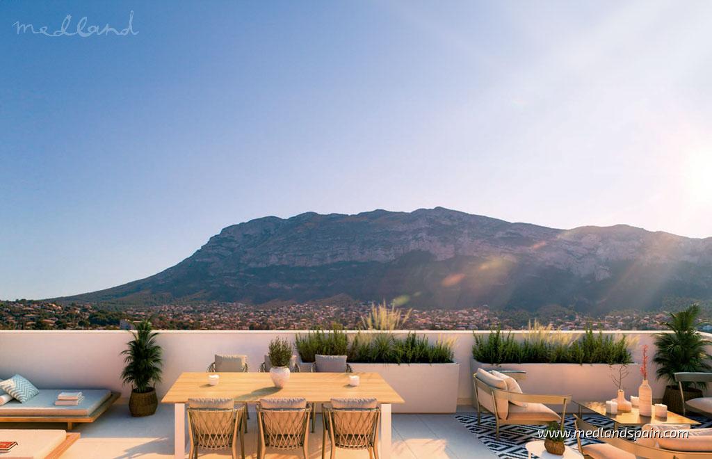 New apartment complex, less than 700m from the beach in Denia. A fantastic location, only 10 minutes’ walk from the yacht club, and close to all the daily amenities, like supermarkets, shops, bars and restaurants. The good road connection makes it possible to reach other tourist areas, like Jávea in 20 minutes, and Calpe in 35 minutes. The airports of Alicante and Valencia are equally just over an hours’ drive from the complex.The complex comprises various buildings, with apartments available with 1, 2, 3 or 4 bedrooms, in a choice of models: ground floor with a private garden, mid floor models with a terrace, and penthouses with a private solarium. All apartments present en open plan living area, combining the kitchen, dining area and lounge in a single space with large windows that open onto the terrace. The master bedroom in all models, except in the model with 1 bedroom, has an en-suite bathroom. Depending on the location of the apartment, certain models enjoy panoramic views of the surrounding mountains.The apartments include ducted A/C, complete bathrooms, a storage room, and a parking space in the underground garage. Depending on the stage of construction, it is possible to customise some of the finishes from a choice of materials; and for an extra price, it is possible to add extra upgrades.The complex includes a beautiful community area, ideal for enjoying the Mediterranean climate, with a large pool for adults and children, surrounded by an area for sunbathing, and large garden spaces. Residents will also have access to other facilities, like a fully equipped gym, community toilets, parking for bicycles, a multipurpose social/community room, access to charging stations for electric cars.