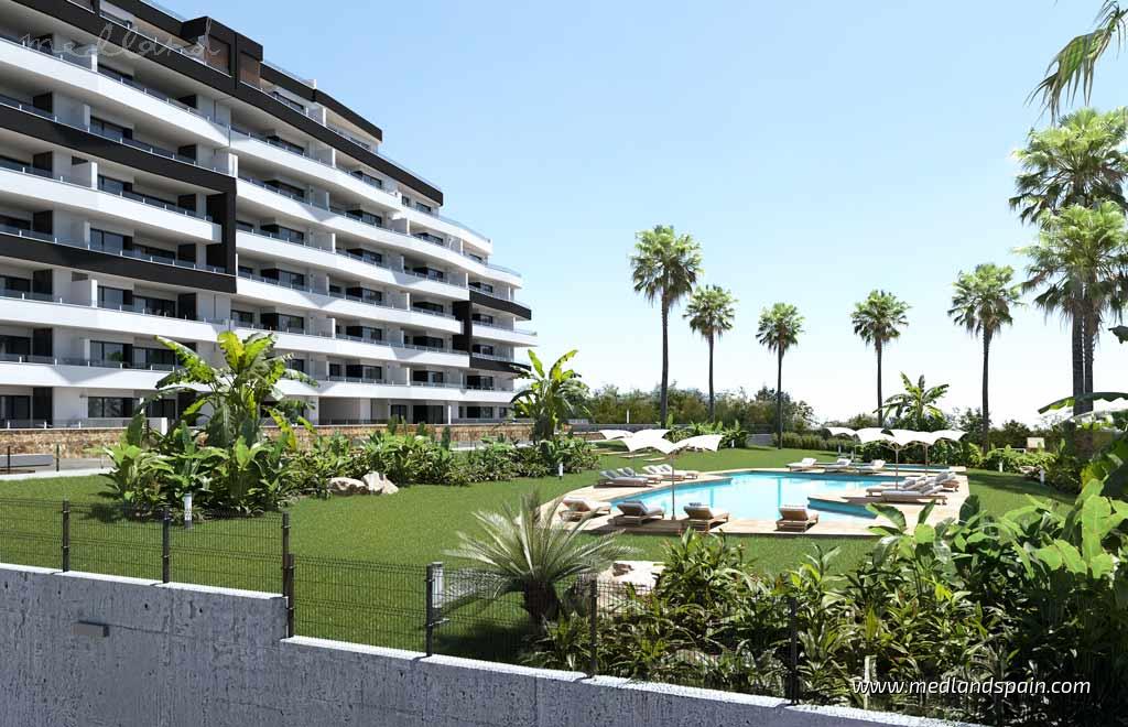 Located only a stone’s through from the centre of San Miguel de Salinas, in the heart of the Costa Blanca. This town embodies the perfect blend of traditional Spanish charm and modern convenience, with stunning views of the salt lagoons of Torrevieja and La Mata. Enjoy easy access to everyday services like supermarkets, restaurants, cafés, and health centres, all within walking distance. Sports enthusiasts have a choice of outdoor activities available close by, as well as a variety of golf courses. The excellent road network makes exploring the coast a breeze, only 10 minutes from the golden beaches of Orihuela Costa, 15 minutes from the bustling town of Torrevieja, and less than an hour to both Alicante and Murcia airports.This modern apartment complex has been designed for comfortable living, with each apartment having a practical design, and featuring 2 bedrooms and 2 bathrooms, an open plan living area, and an en-suite master bedroom. Choose between different models to suit any lifestyle:• Ground-floor models with a private garden• Mid-floor models with a spacious terrace, or a larger corner terrace• Penthouses with a large corner terrace, or a private solariumEach apartment is equipped with the highest quality finishes, and, for a limited time, will include furniture, ducted A/C, white goods, fitted wardrobes, electric blinds, a storage room, and a parking space. Ask your advisor for details!This gated complex offers fantastic community areas designed for relaxation, with a pool for adult and one for children, accessible landscaped gardens, a children’s playground, and a petanque terrain—ideal for outdoor enjoyment with family and friends. This complex provides a comfortable and secure environment in a privileged location.Don’t miss this opportunity to enjoy an exceptional home, in a charming atmosphere, close to all amenities, and well connected to both airports, ideal for holiday visits, for permanent living, or for a smart investment.
