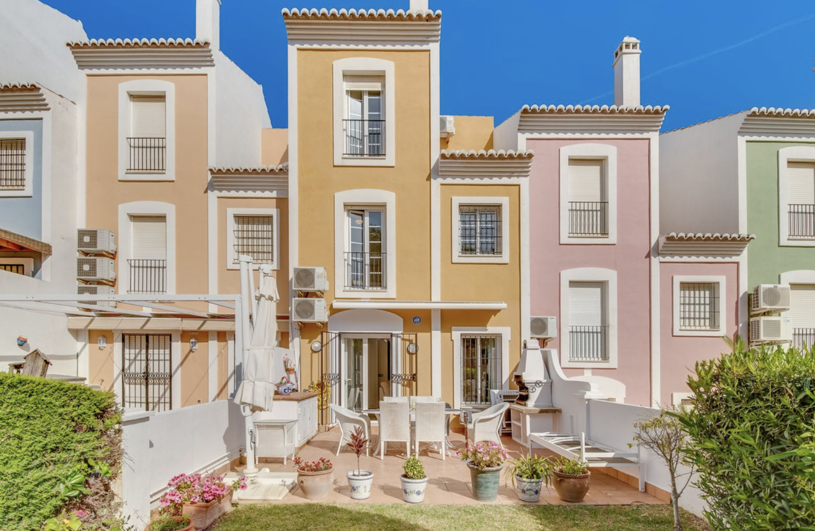 The property offers three bedrooms, plus an unusually large private garden and patio area with plenty of room for a dining table and chairs, as well as several sun loungers.
