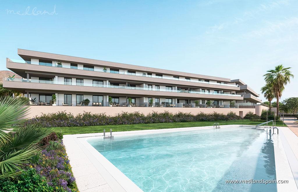 New, frontline golf apartment complex in Estepona. The area offers all the necessary day-to-day services, as well as a wide range of leisure activities and wonderful beaches, only 10 minutes away. A privileged location between the sea and the mountains, making it possible to enjoy the forest as well as the extensive coastline of almost 20km between Puerto Banús and Sotogrande. The road network, with the AP7 and A7 motorways, connects the complex with other areas, like Marbella or Sotogrande in 30 minutes, and Malaga international airport in less than an hour.Apartments with 1, 2 and 3 bedrooms, available in ground floor models with a private garden, and mid-floor or penthouse models with large terraces. The apartments are south facing, benifit from the many hours of natural light every day. The spacious living area combines the open kitchen, dining room and lounge into a single space with access to the fantastic terrace. The master bedroom has a private bathroom, except in the models with 1 bedroom, and in some models, also with access to the terrace. Some apartments have a sea view.These apartments include a fully equipped kitchen with white goods, ducted A/C, colour video intercom, a parking space and a storage room.The residential complex is completely gated with controlled access, providing security for residents. The community areas are perfect for enjoying the fantastic Mediterranean climate, and include a community pool with decorative night lighting, large gardens, a sun terrace, a gym, a zen area, and putting green.