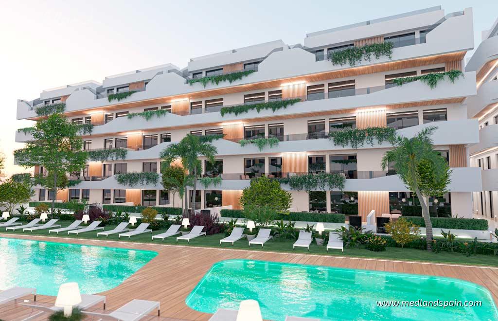 These touristic apartments in Santiago de la Ribera, on the Costa Cálida, are designed for modern holiday living, combining comfort, quality, and investment potential in one of the sunniest areas on the Spanish coast. Set just 750 metres from the beaches of the Mar Menor, the development enjoys a privileged location with excellent access to international travel: Murcia Airport is just 30 minutes away by car, while Alicante Airport can be reached in under an hour.The residential complex is composed of several apartment blocks distributed over five levels, each offering open views of the community gardens and pools. Buyers can choose from three distinct layouts: ground floor apartments with extended outdoor spaces, mid-floor apartments with generous 18 m² terraces, and penthouses with private rooftop terraces. All homes feature three bedrooms and two bathrooms, and come equipped with white goods, indoor and outdoor lighting, and pre-installation for ducted air conditioning. There is an open-air parking area within the community, and buyers also have the option to purchase a garage space and storage room.The community includes a reception area and beautifully landscaped communal areas finished with artificial grass, palm trees, and native vegetation. These touristic apartments are ideal for buyers looking for a dual-purpose property: personal enjoyment and rental income. A tourist license is already granted for each apartment, allowing short-term holiday rentals from the outset.Santiago de la Ribera is a coastal town on the Costa Cálida, known for its calm beaches and relaxed Mediterranean atmosphere. The area offers beachfront promenades, local restaurants, water sports on the Mar Menor, and easy access to golf courses and marinas.Please note: These homes are intended for *touristic use only* and cannot be used as permanent residences. Their location near the beach, international airports, and essential services makes them a perfect option for seasonal getaways or holiday rental investment.