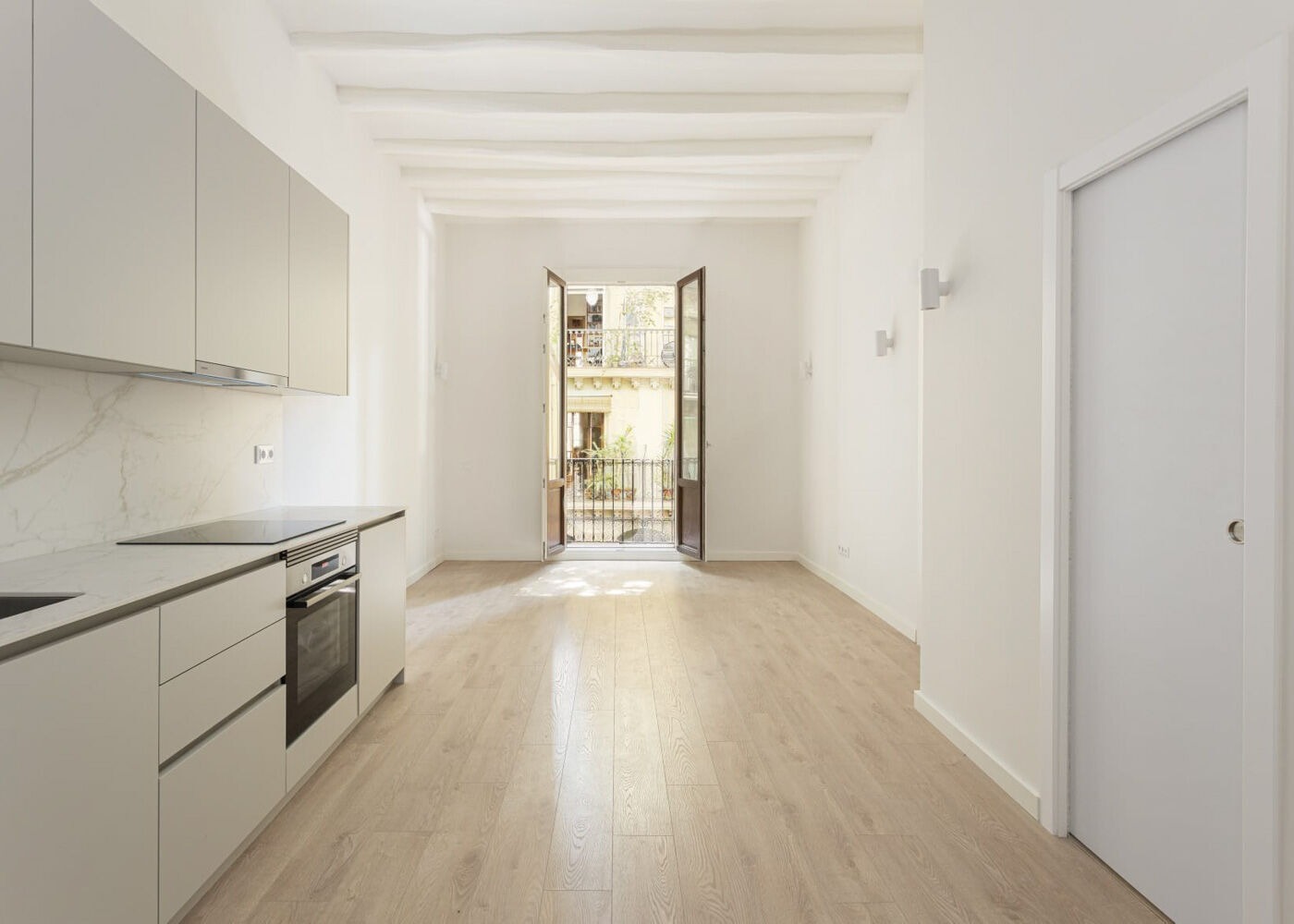 This fully renovated 2-bedroom, 2-bathroom apartment is ready to move in. Located on the first floor of an iconic building on Calle Margarit, Poble Sec, it perfectly blends the historic charm of Barcelona architecture with contemporary, functional design.Original features such as high ceilings with Catalan vaults and exposed wooden beams add light and character. The open-plan living area opens onto a balcony overlooking the vibrant Montjuic neighborhood.