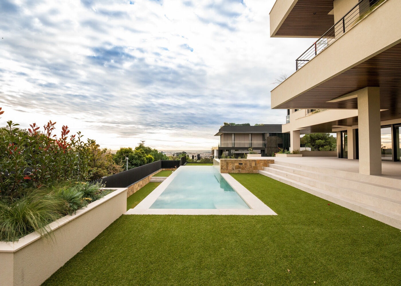 From the living area, you access a covered porch and the garden with its lush lawn, pool, and overflow jacuzzi.