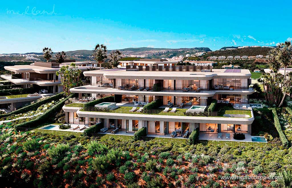 New, exclusive apartment project with fantastic panoramic sea views in Casares, less than 10 minutes drive from the coast. The area, located between Estepona and Manilva, has gained recognition in recent years for its wide selection of golf courses, leisure activities, gastronomic experiences, quality services. Casares is known as one of the typical white villages of the Costa del Sol, characterised by its Andalusian charm. It is a perfect area for nature lovers and outdoor activities, like hiking, water sports, horse riding and polo. The excellent road network makes it possible reach various tourist destinations quickly, like Estepona in 15 minutes, Manilva in 20 minutes, and Marbella and Puerto Banús in 35 minutes. Malaga airport is also only 1 hour away, while Gibraltar airport is 45 minutes from the project.The project comprises modern apartments distributed in buildings of three floors each, and are available with 2 and 3 bedrooms, and in a variety of models: ground floor models with 2 bedrooms and a garden, including corner models with a private pool; mid-floor models with 2 bedrooms and a large terraces; corner models with 3 bedrooms, garden and private pool; as well as exclusive penthouses with 3 bedrooms and large terraces. These apartments set themselves apart with their innovative architectural design, with soft and organic lines that blend harmoniously into the natural environment, making the most of natural light and offering spacious terraces. Located in an elevated area, all apartments enjoy spectacular panoramic sea views. All models have an open plan living area, combining the kitchen, lounge and dining room in a single space with large windows that open onto the terrace.The apartments are built with top quality materials and include air conditioning system, underfloor heating, fully equipped kitchens and bathrooms, smart home system to control the lights and A/C, a storage room and a parking space in the communal underground garage. The penthouses have 2 parking spaces. The complex is completely gated with 24hr security. The fantastic communal areas include the infinity salt-water pool, surrounded by large areas for relaxation with sun loungers and a bar, beautiful Mediterranean/tropical style gardens, and an outdoor gym. Residents will also have access to indoor facilities like a fully equipped gym, with changing rooms and direct access to the exclusive Spa area, which has a heated pool, sauna, jacuzzi and a massage room.