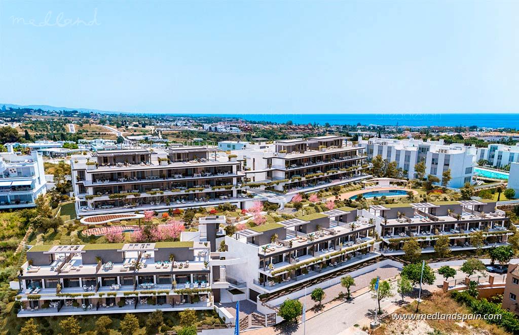 Apartments and terraced villas in Estepona, located in the charming area of Cancelada on the New Golden Mile, a privileged residential setting that combines contemporary architecture with Mediterranean serenity. Nestled less than 2 km from the sea and just 50 minutes by car from Málaga Airport, the development enjoys an exceptional location surrounded by golf courses, high-end leisure options and all essential services, making it one of the most desirable areas on the Costa del Sol. All homes enjoy beautiful sea views and have been designed to maximise natural light and a seamless connection with the surrounding landscape.The apartments feature 2 and 3 bedrooms, with open-plan layouts and spacious interiors that extend naturally towards generous terraces through large sliding windows. Some ground-floor apartments include private garden areas, while the penthouses enjoy large solariums perfect for relaxing in the sun. The 3-bedroom duplex penthouses stand out for their two terraces, creating an exceptional link between indoor and outdoor living and offering panoramic views of the Mediterranean. Each apartment comes with a parking space and storage room for maximum convenience.The terraced villas include 3 bedrooms and 3 bathrooms, distributed over two floors and complemented by a basement and a private solarium. The basement features a private garage and a storage area, providing both practicality and comfort. The main level offers a bright, open-plan living room, with dining space and kitchen, that opens onto the terrace along with a guest toilet. On the lower floor are the 3 bedrooms, each with an en-suite bathroom, and this level also opens onto another terrace and a private garden. The rooftop solarium is the perfect spot to enjoy the panoramic sea views and the peaceful Mediterranean atmosphere. A lift connects all floors for greater comfort and accessibility.Every home stands out for its high-quality finishes, open-plan kitchens fully equipped with appliances, underfloor heating in bathrooms and air conditioning with smart app control. The communal areas include a swimming pool, Mediterranean-style gardens, walking paths, relaxation zones, a social lounge, spa, gym and a chill-out area for yoga and wellness. Designed to offer a perfect balance between comfort, elegance and nature, this exceptional residential environment embodies the essence of Mediterranean living on the Costa del Sol.