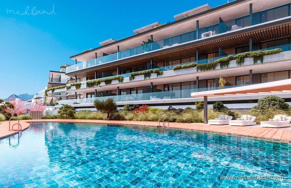 Apartments and terraced villas in Estepona, located in the charming area of Cancelada on the New Golden Mile, a privileged residential setting that combines contemporary architecture with Mediterranean serenity. Nestled less than 2 km from the sea and just 50 minutes by car from Málaga Airport, the development enjoys an exceptional location surrounded by golf courses, high-end leisure options and all essential services, making it one of the most desirable areas on the Costa del Sol. All homes enjoy beautiful sea views and have been designed to maximise natural light and a seamless connection with the surrounding landscape.The apartments feature 2 and 3 bedrooms, with open-plan layouts and spacious interiors that extend naturally towards generous terraces through large sliding windows. Some ground-floor apartments include private garden areas, while the penthouses enjoy large solariums perfect for relaxing in the sun. The 3-bedroom duplex penthouses stand out for their two terraces, creating an exceptional link between indoor and outdoor living and offering panoramic views of the Mediterranean. Each apartment comes with a parking space and storage room for maximum convenience.The terraced villas include 3 bedrooms and 3 bathrooms, distributed over two floors and complemented by a basement and a private solarium. The basement features a private garage and a storage area, providing both practicality and comfort. The main level offers a bright, open-plan living room, with dining space and kitchen, that opens onto the terrace along with a guest toilet. On the lower floor are the 3 bedrooms, each with an en-suite bathroom, and this level also opens onto another terrace and a private garden. The rooftop solarium is the perfect spot to enjoy the panoramic sea views and the peaceful Mediterranean atmosphere. A lift connects all floors for greater comfort and accessibility.Every home stands out for its high-quality finishes, open-plan kitchens fully equipped with appliances, underfloor heating in bathrooms and air conditioning with smart app control. The communal areas include a swimming pool, Mediterranean-style gardens, walking paths, relaxation zones, a social lounge, spa, gym and a chill-out area for yoga and wellness. Designed to offer a perfect balance between comfort, elegance and nature, this exceptional residential environment embodies the essence of Mediterranean living on the Costa del Sol.
