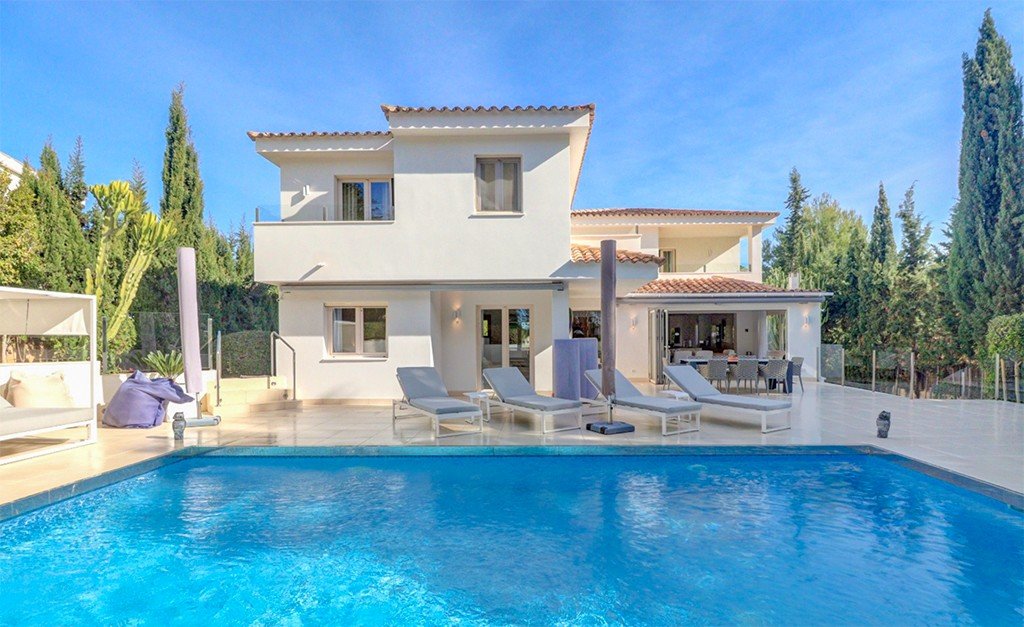 This lovely modern and spacious villa is located in one of the most prestigious locations in santa Ponsa, the southwest coast of Mallorca. Completely renovated, the house offers a lovely and spacious living room with fireplace, dining area and direct access to the garden and pool, a fully equipped open kitchen, 4 bedrooms, each with a private bathroom, dressing room and private balconies. There is a spacious garage for 2 cars and a storage room. Lovely manicured gardens complement the overall picture, a large swimming pool with sunbathing and relaxation area, barbecue area, outdoor terraces and summer dining areas. The villa is completely renovated and furnished with beautiful designer furniture. All floors are heated and an automatic air conditioning system is installed. A beautiful sandy beach is located within walking distance, all the necessary infrastructure is located nearby. Call or email us right now and get a free consultation on this object! Do not hesitate to contact our real estate agency "GRUPO TERRASUN" with any questions about the object for any additional information about organizing a visit!Features