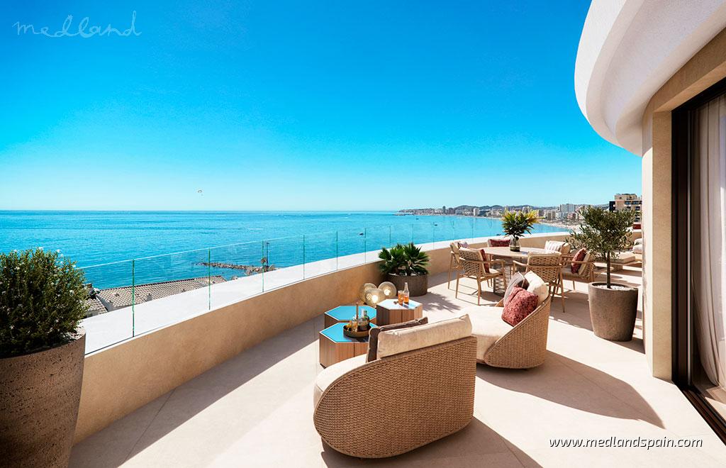 Exclusive apartments in Fuengirola just 100 metres from the beach, where contemporary architecture, natural light and the Mediterranean come together to define an elegant coastal lifestyle. This boutique residential concept is set in a privileged position close to the shoreline between Fuengirola and Benalmádena, designed for those who want the sea to be part of everyday life. The proximity to the beach, combined with privacy and open views towards the Mediterranean, creates a calm and refined atmosphere that feels both connected and exclusive.The project offers a carefully curated selection of apartments and penthouses with 2 and 3 bedrooms, conceived to maximise light, comfort and views. Interiors are organised around open-plan living spaces that flow naturally and extend onto generous terraces, allowing indoor and outdoor living to connect effortlessly and making the most of the coastal climate throughout the year.Designer kitchens come fully equipped with appliances, while bathrooms are fully equipped and finished to a high standard. Underfloor heating throughout the home and fully installed air conditioning via an aerothermal system ensure year-round comfort, complemented by built-in wardrobes with integrated LED lighting. Each home includes 2 or 3 parking spaces and a storage room.The communal areas are designed as an extension of everyday living, offering a lifestyle comparable to a private club by the sea. Residents can enjoy an outdoor infinity salt-water pool and LED lighting, an indoor pool, sauna, yoga area and a fully equipped gym. Social and professional spaces include a gastroteca, sports bar and coworking area, complemented by landscaped green zones and a putting green integrated into the surroundings. A welcoming lobby and smart lockers for online deliveries complete the shared facilities.A panoramic public-use lift connects directly with the beach and some of the area’s best restaurants, reinforcing the sense of living just steps from the Mediterranean while adding comfort and accessibility. The location also offers excellent connectivity, with Málaga Airport reachable in approximately 20 minutes by car, as well as easy access to the train station and the wider Costa del Sol. These apartments and penthouses present a balanced and elegant way of living by the sea, where location, design and wellbeing come together with quiet confidence.