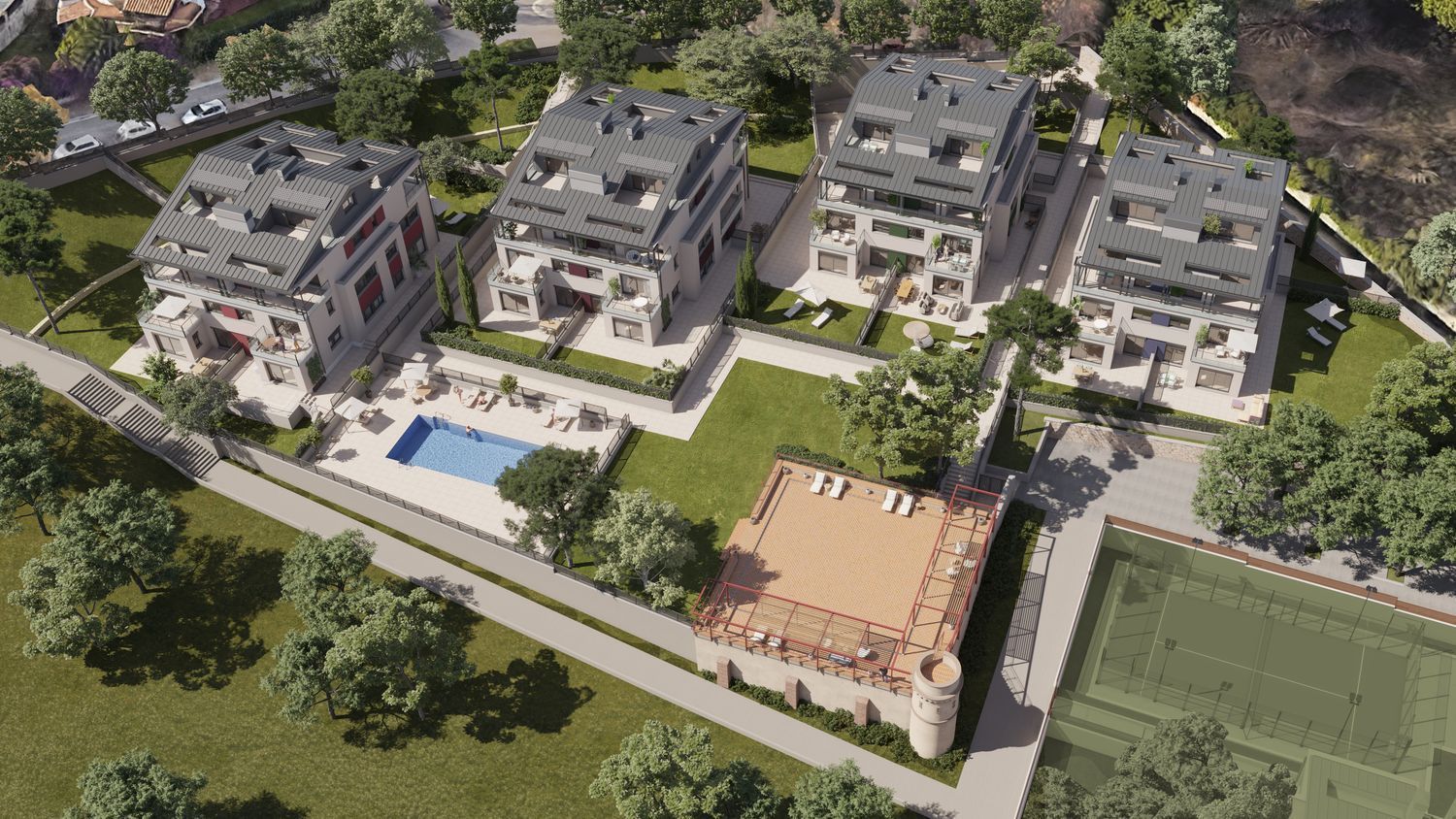 Equipped with an aerothermal system for sustainable climate control, the project also includes a refreshing communal swimming pool. Each home comes with a storage room and two parking spaces, ensuring maximum convenience.