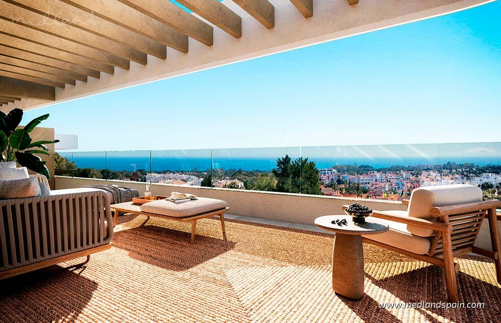 These apartments in Estepona are located in a peaceful residential enclave on the western Costa del Sol, within the sought-after New Golden Mile between Estepona and Marbella. This low-rise residential setting combines contemporary Mediterranean architecture with landscaped surroundings and excellent connections to beaches, golf courses, and everyday amenities. Just 1.8 km from the Mediterranean Sea and around a 45-minute drive from Málaga Airport, the location places residents within easy reach of both coastal leisure and international travel. The area is well established and close to renowned golf courses, beach clubs, marinas, international schools, and a wide range of dining spots and services.The development comprises apartments with 1, 2 and 3 bedrooms, designed to maximise light, space, and the connection between interior living areas and outdoor terraces. Open-plan kitchens integrate naturally with the living area, creating an environment suited to both everyday living and entertaining.