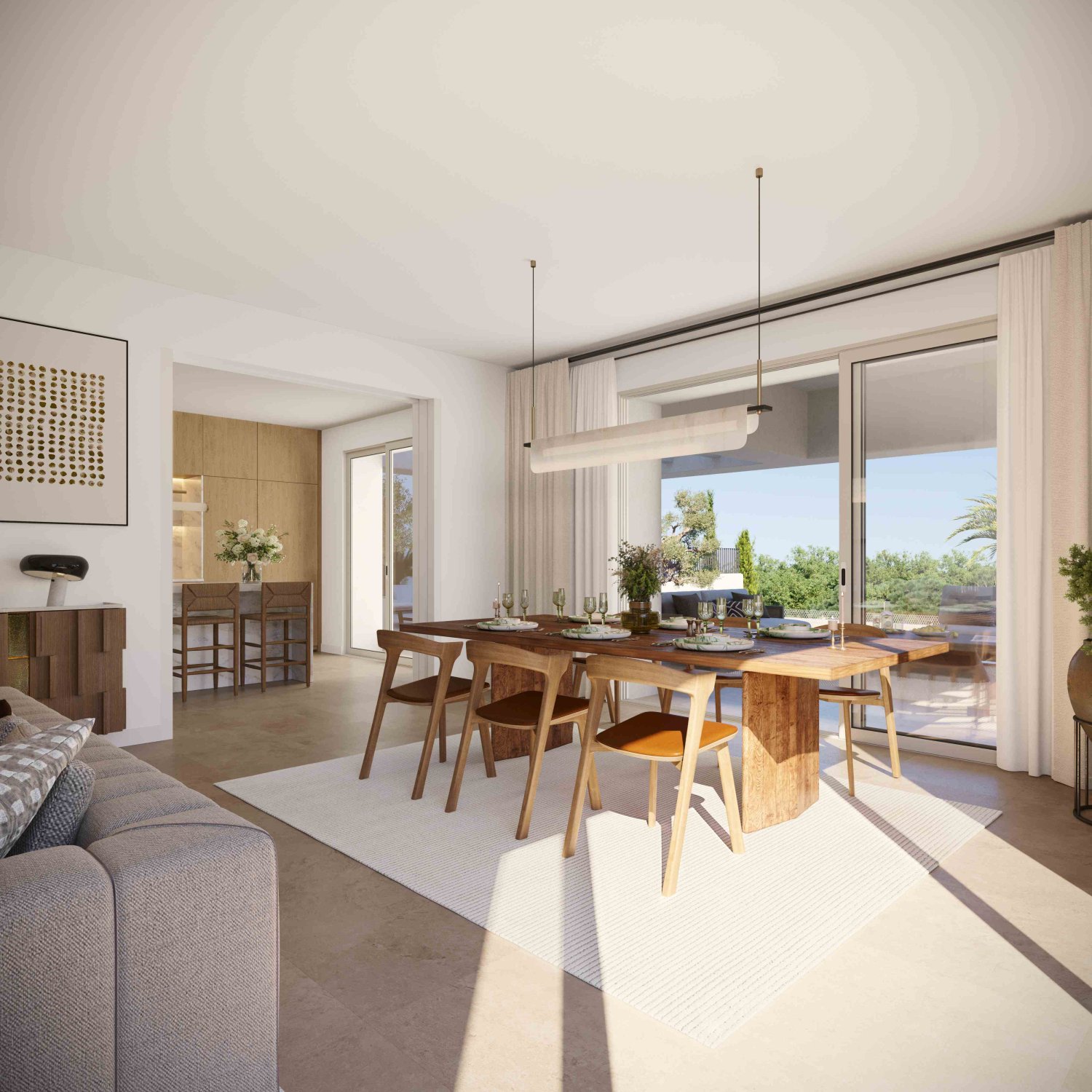 The exteriors of these semi-detached homes are designed to maximize enjoyment of the Mediterranean climate. Each home features a private garden, perfect for relaxing or enjoying outdoor activities. Additionally, they have a terrace that offers extra space for leisure and entertainment. The inclusion of a private pool in each property allows for a refreshing swim in the privacy of your home. Proximity to the sea and golf course adds extra appeal for nature and sports enthusiasts.