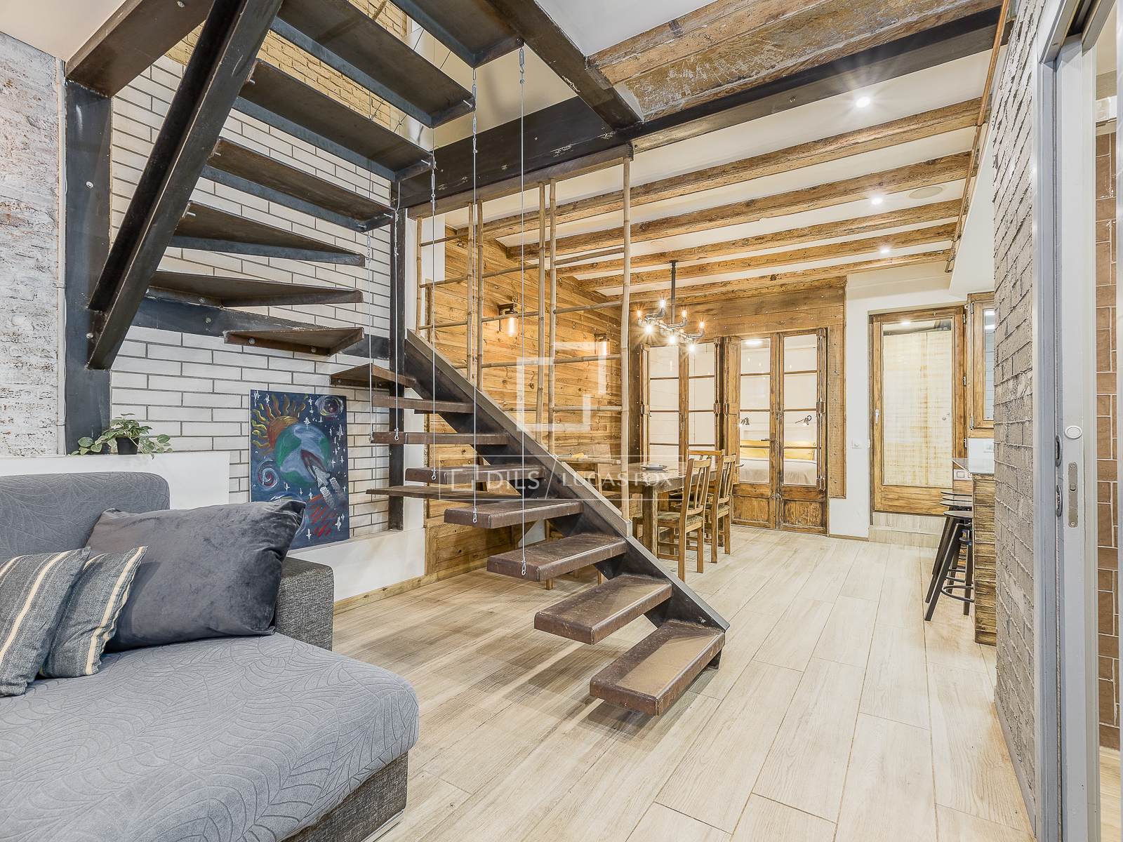 Located in the vibrant neighbourhood of El Raval, this beautifully renovated duplex perfectly blends Barcelona’s historic charm with contemporary design. The property stands out for its warm, inviting atmosphere, enhanced by original architectural features such as exposed brick walls, wooden ceiling beams, and carefully restored textures that add character throughout.The main living area is attractive and stylish, centered around a comfortable lounge space with a modern sofa and soft lighting that creates an intimate ambiance. A striking open staircase with metal framing and wooden steps adds a bold architectural touch, seamlessly connecting the two levels. The space flows naturally toward a sleek, open-plan kitchen, where a custom-built island with wood finishes and integrated lighting becomes the heart of the home, ideal for both casual dining and entertaining.