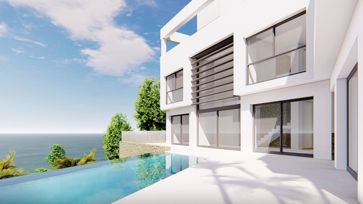 Villa for sale with incredible sea views in Villajoyosa. The house has 4 bedrooms, 4 bathrooms, a kitchen-dining room, a living room, a huge terrace. The villa has three floors: ground floor, first, second and rooftop solarium. On the site there are three parking spaces and a swimming pool with an area of 20 sq. The villa offers beautiful views of the sea and mountains. The center of Villajoyosa is 5 km away.Location