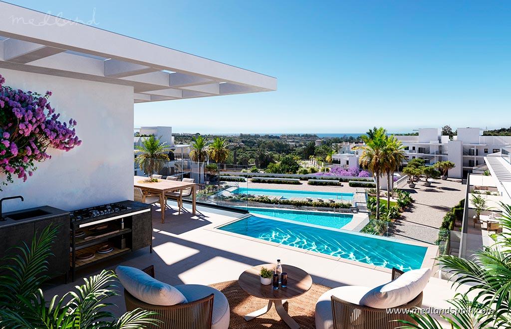 Set in Estepona on the western Costa del Sol, within the area known as the New Golden Mile, this collection of contemporary apartments enjoys a peaceful setting defined by views towards the Mediterranean and the surrounding mountains. Located less than 2 km from the beach, the area combines a natural landscape with convenient access to everyday amenities, creating a balanced environment for year-round living.The development comprises apartments with 2 and 3 bedrooms, designed to emphasise light, comfort, and a seamless connection with outdoor living. Each home features spacious exterior areas that extend the living space, ideal for relaxing or dining outdoors. The layouts are carefully arranged to enhance flow between indoor and outdoor areas, while penthouses are distributed across two levels, with the upper floor dedicated to a bedroom with an en-suite bathroom and a private solarium that adds an additional dimension to the home.The properties include fully fitted kitchens with appliances, air conditioning, and underfloor heating, contributing to comfort throughout the year. Electric blinds are installed in bedrooms and the living area, and pre-installation for a basic Smart Home is included. Each property also benefits from 1 or 2 parking spaces and a storage room. Depending on the stage of construction, there are options to personalise certain finishes, while the penthouse includes the possibility of adding a private pool on the solarium at an additional cost.The communal areas are designed to complement the residential experience, featuring landscaped gardens, a recreational swimming pool alongside a 25-metre infinity pool, as well as a gym and coworking space. There is also a dedicated pet washing area, adding practical convenience to the shared environment.Estepona continues to be one of the most desirable areas on the Costa del Sol, known for its blend of traditional charm and modern lifestyle. The development is within comfortable driving distance of Málaga Airport, which can be reached in around 50 minutes, making it well connected for both permanent living and regular travel.