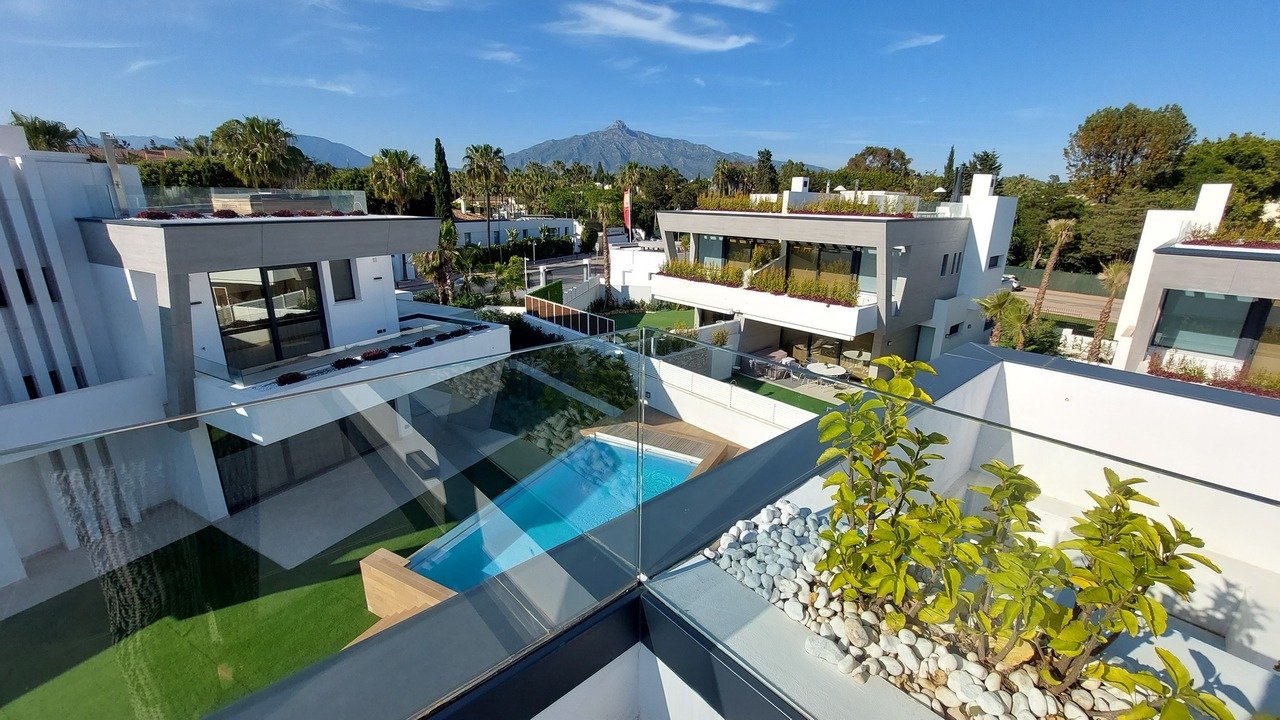 In Puerto Banús, just 300 metres from the Playa del Duque beach which can be reached on foot, we find this magnificent semi-detached villa on 4 floors including basement with garage for 2 cars and solarium with barbecue area and jacuzzi. Its decoration is minimalist, its clean lines and vegetation populates the surroundings of the houses.With large floor to ceiling windows throughout the house, the living room windows open up the space to a large covered terrace, the swimming pool and the well-kept private garden. There are 3 spacious bedrooms, the master with dressing room and en suite bathroom. The interiors are elegant and welcoming, reflecting a tranquil and contemporary lifestyle.