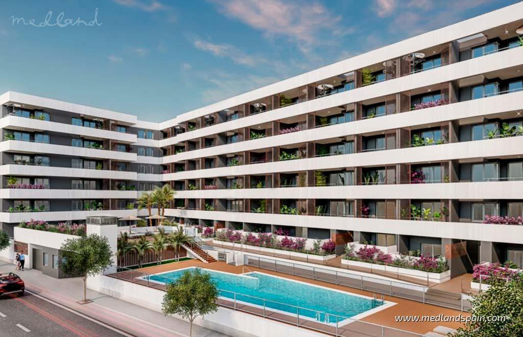 Новый проект из апартаментов всего в 250 метрах от пляжа и пристани для яхт Агилас, на побережье Коста Калида. Агилас — один из главных городов на побережье Мурсии, с большим выбором услуг для повседневной жизни, а также нетронутыми пляжами и высоко ценимыми возможностями подводного дайвинга. Умеренный климат этого района делает его идеальным для занятий активным отдыхом круглый год, например, гольфом, пешими походами по трем основным горным хребтам природных заповедников Кабо Копе и Пунта де Кальнегре, не забывая при этом о разнообразии водных видов спорта, доступных на 35 песчаных пляжах. Дорожная сеть позволяет быстро и легко добраться до других туристических районов Мурсии, а также до аэропорта Мурсии чуть более часа или аэропорта Альмерии за 1,5 часа.Современный комплекс, представляющий апартаменты с 2 или 3 спальнями, расположенные в семиэтажном здании. Апартаменты доступны в различных моделях: модели на первом этаже с просторной террасой, модели на среднем этаже и модели на верхнем этаже с двумя террасами. Во всех апартаментах есть гостиная с открытой планировкой, которая выходит на террасу, создавая очень светлое внутреннее пространство. В зависимости от высоты комплекса из некоторых апартаментов открывается вид на море.В апартаментах есть канальный кондиционер, частично бытовая техника, встроенные шкафы, место для парковки и кладовая на подземном этаже. В зависимости от стадии строительства возможен индивидуальный подход на выбор из различных материалов. Аналогичным образом, за дополнительную оплату, можно дополнительно иметь индивидуальный подход в апартаментах, добавив дополнительные улучшения.Комплекс полностью закрытый, что обеспечивает жильцам безопасную и приватную среду. Общественные удобства включают большой бассейн для взрослых и детей, ландшафтные сады, крытый тренажерный зал и общественный лаундж.