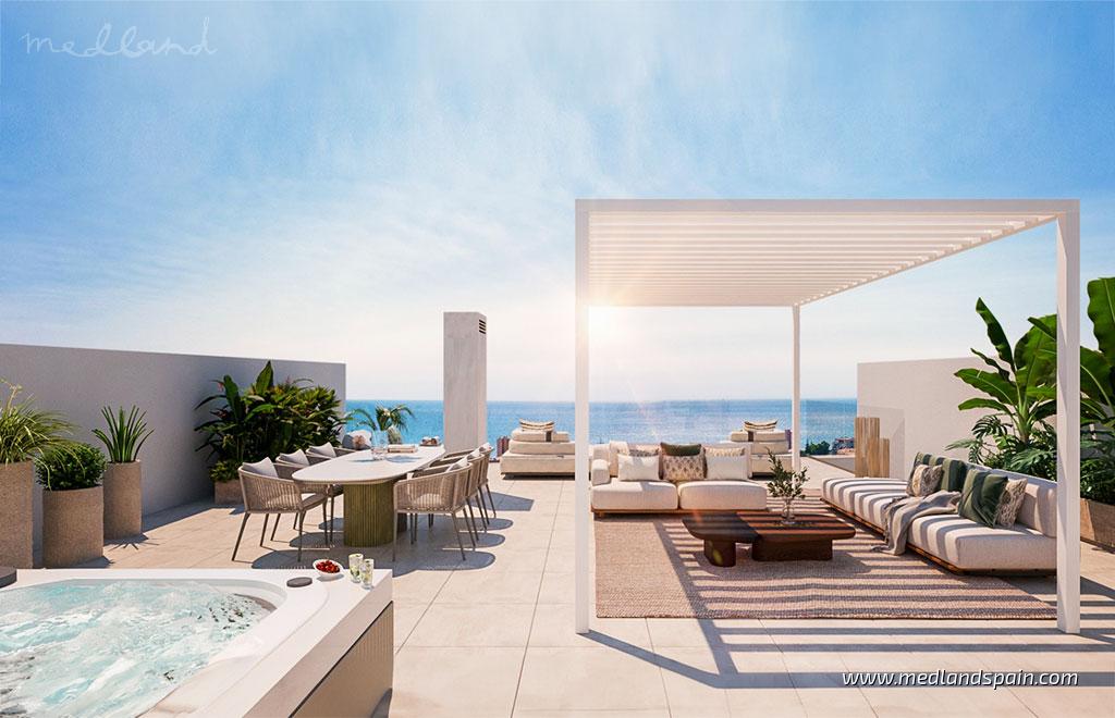 Основная жилая зона с открытой планировкой объединяет кухню, столовую и гостиную в единое пространство с большими окнами, выходящими на террасу. Плавный переход от внутренних помещений к пространству снаружи позволяет проникать как можно большему количеству естественного света и наслаждаться захватывающим климатом побережья Коста дель Соль. В главной спальне во всех моделях есть собственная ванная комната и выход на террасу.Эти апартаменты включают полностью оборудованную кухню с бытовой техникой, канальный кондиционер (охлаждение/подогрев), прачечную, кладовую и  место для парковки. В зависимости от стадии строительства можно подобрать различные варианты отделки.Особого внимания заслуживают общественные зоны с большими ландшафтными садами, бассейнами с соленой водой, зоной отдыха и йоги, зоной для пикника и парковкой для велосипедов. Другие исключительные удобства включают зону отдыха, спа-центр с турецкой баней, джакузи и сауной, крытый тренажерный зал и общий лаунж с помещениями для совместной работы, мультимедийным оборудованием и игровой зоной.
