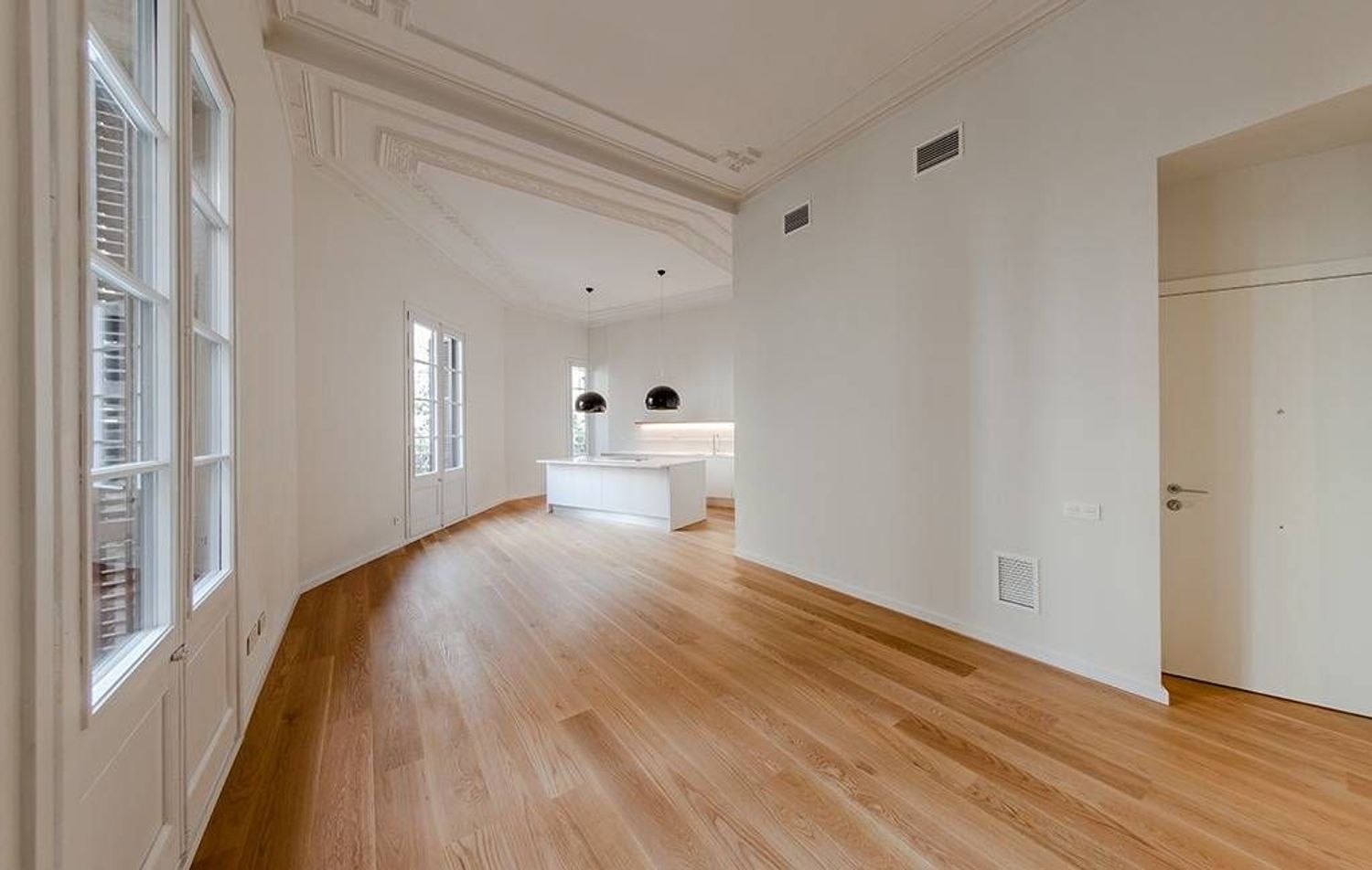 Все комнаты имеют выход на балконы — характерную особенность района Эшампле, обеспечивающую естественное освещение и связь с городской средой. Дневная зона представляет собой открытое пространство площадью около 43 м², объединяющее гостиную, столовую и полностью оборудованную кухню. Это пространство сочетает функциональность, комфорт и стиль.