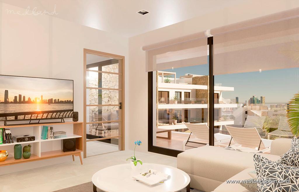 Новый жилой комплекс в Финестрате всего в 10 минутах от прекрасных пляжей Бенидорма. Комплекс идеально расположен недалеко от торгового центра La Marina с широким выбором удобств для повседневной жизни, включая супермаркет, магазины, бары и рестораны. Любители активного отдыха могут заняться различными видами деятельности, такими как гольф, пешие прогулки и водные виды спорта на близлежащем пляже, есть парки развлечений. До этого района также легко добраться благодаря отличной дорожной сети, соединяющей всю территорию Коста Бланки. Аэропорт Аликанте находится всего в 45 минутах на машине, а железнодорожная станция AVE — всего в 40 минутах на машине. Комплекс будет состоять из нескольких трехэтажных блоков и включать апартаменты с 2 спальнями и 2 ванными комнатами, доступных в различных моделях: модель на первом этаже с частным садом, модель на среднем этаже с террасой и модель на верхнем этаже с частным солярием. Во всех апартаментах есть гостиная с открытой планировкой, столовая и кухня, которая выходит на террасу. В зависимости от этажа, на котором находятся апартаменты, из апартаментов открывается панорамный вид на горизонт Бенидорма и Средиземное море. Апартаменты включают полностью установленный канальный кондиционер, бытовую технику, электрические жалюзи, внутреннее освещение, светодиодное наружное освещение, видеодомофон, кладовую и место для парковки. Проект предлагает широкий выбор вариантов индивидуального подхода, а также обновления за дополнительную оплату, например, частный бассейн в моделях на первом этаже или джакузи в солярии в моделях на верхнем этаже. Спросите у консультанта о различных вариантах. Комплекс полностью закрытый, повсюду ведется видеонаблюдение, что обеспечивает безопасность и конфиденциальность для всех жителей. Общественная территория включает в большой бассейн для взрослых и детей, красивые сады, детскую игровую площадку, зону отдыха, тренажерный зал с джакузи, раздевалками и душем. На территории сообщества есть крытая парковка и кладовые, а также парковка для велосипедов и самокатов, а также зарядные станции для электромобилей.
