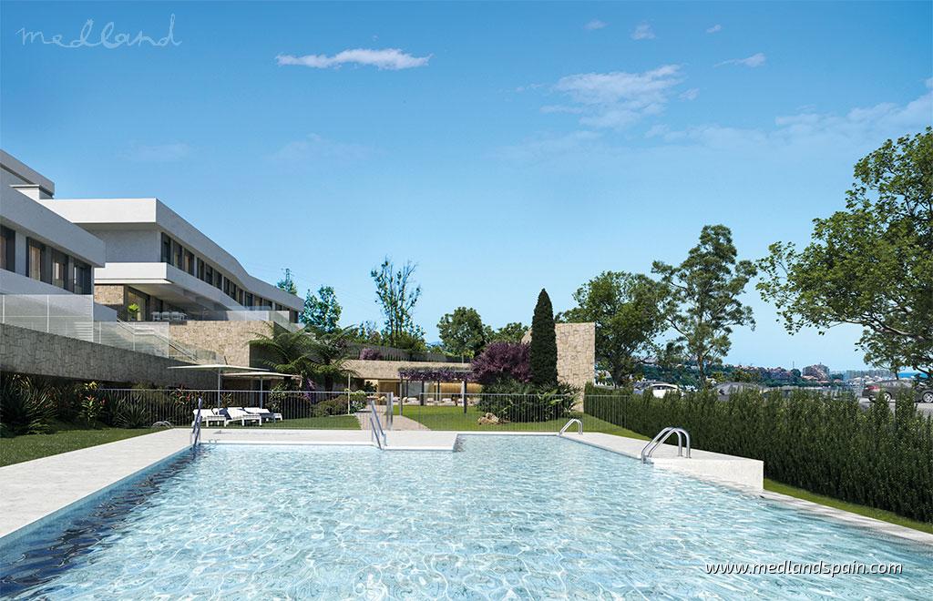 Exklusivt bostadsprojekt med fantastisk havsutsikt, beläget i ett privilegierat läge väster om Estepona. Mindre än 300 meter från stranden och endast 10 minuters bilresa från stadens centrum, småbåtshamnen och den livliga strandpromenaden i Estepona. Området erbjuder all nödvändig service samt ett brett utbud av fritids- och kulturaktiviteter. Andra viktiga turistområden på Costa del Sol som Marbella och Sotogrande, ligger bara 30 minuter bort med bil. Till Malagas flygplats, med flyg till hela världen, tar det 50 minuter.Projektet presenterar moderna lägenheter med 2, 3 eller 4 sovrum och stora terrasser samt radhus i 2 plan med 3 sovrum och en liten privat trädgård. Tack vare sitt privilegierade läge och sin orientering har alla hem fantastisk havsutsikt. Vardagsrummet är i öppen planlösning med kök och matplats med stora fönster som vetter mot terrassen.Bostäderna är byggda enligt högsta standard, det inkluderas fullt utrustat kök med vitvaror, kanalförsedd A/C, golvvärme i hela bostaden, förråd och, beroende på modell, en eller två parkeringsplatser i det gemensamma garaget. Beroende på byggskede är det möjligt att personifiera bostaden efter varje ägares önskemål.Området är helt gated med videoövervakning, vilket säkerställer en säker miljö för de boende. De gemensamma utrymmena är idealiska för att njuta av det behagliga medelhavsklimatet med en stor utomhuspool, trädgårdsområden, multifunktionella rum, fullt utrustat gym och plats för cyklar.