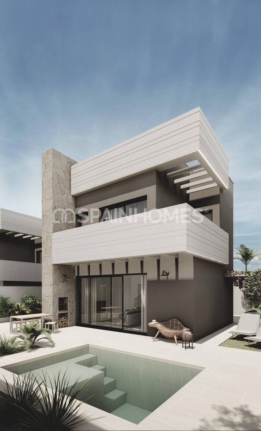 Bostäder med 3 Sovrum och Pool i San Juan de los Terreros, AlmeríaVillorna i San Juan de los Terreros Spanien till salu erbjuder en rymlig interiör med moderna funktioner. Bottenvåningen består av ett vardagsrum med öppen planlösning med kök, matplats och ett gästbadrum. På övervåningen har det stora sovrummet en klädkammare och ett eget badrum, medan ytterligare två dubbelrum med inbyggda garderober delar ett elegant gästbadrum. Alla bostäder har förinstallationer för solpaneler, hemautomation, videoövervakning och elektriska grindar.